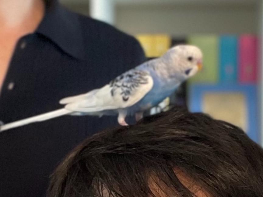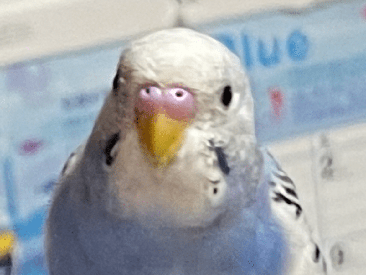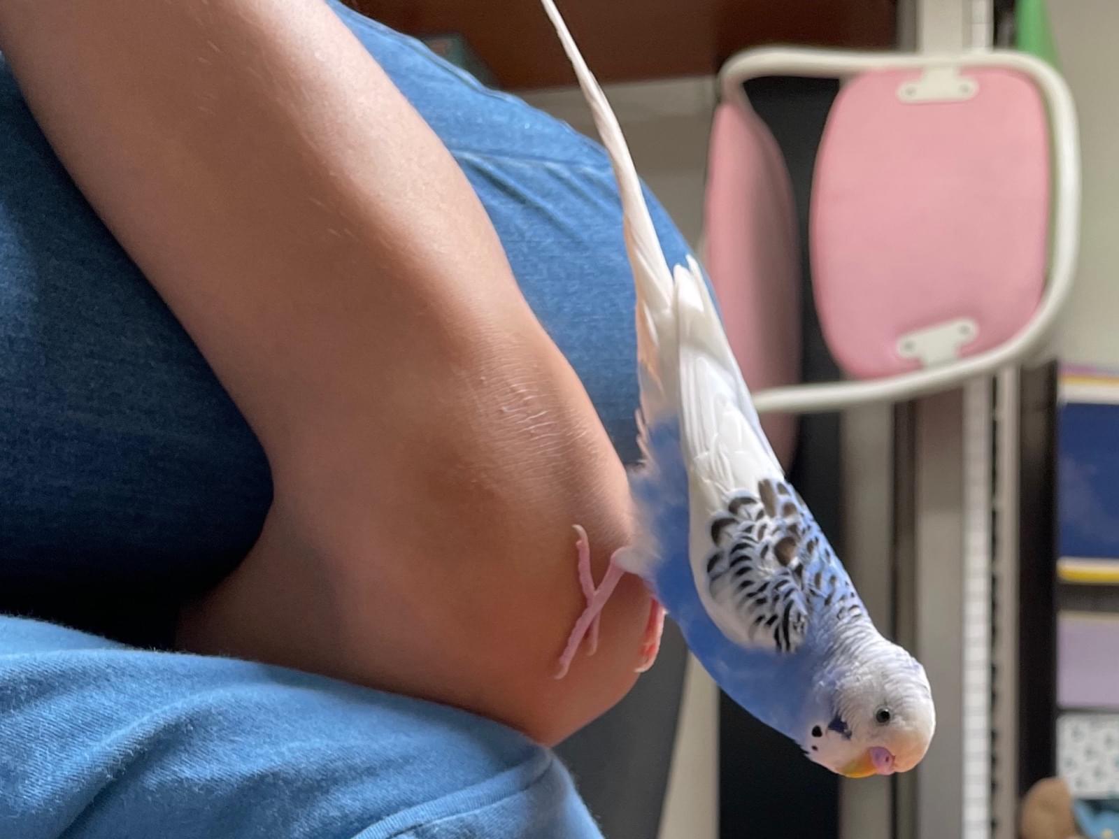 頭とお腹が少し白いノーマルブルーのセキセイインコです人懐っこい性格なので、呼びかけると形になってくると思います。