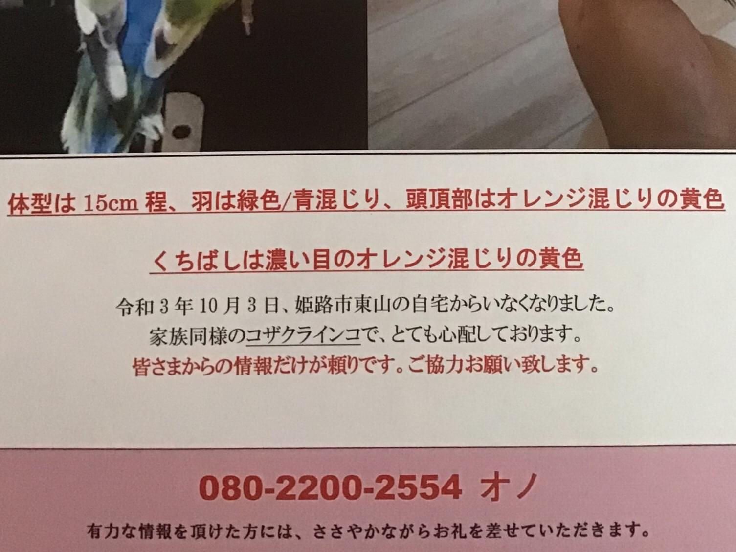 飾磨警察に遺失届済み。保健所に連絡済み。です