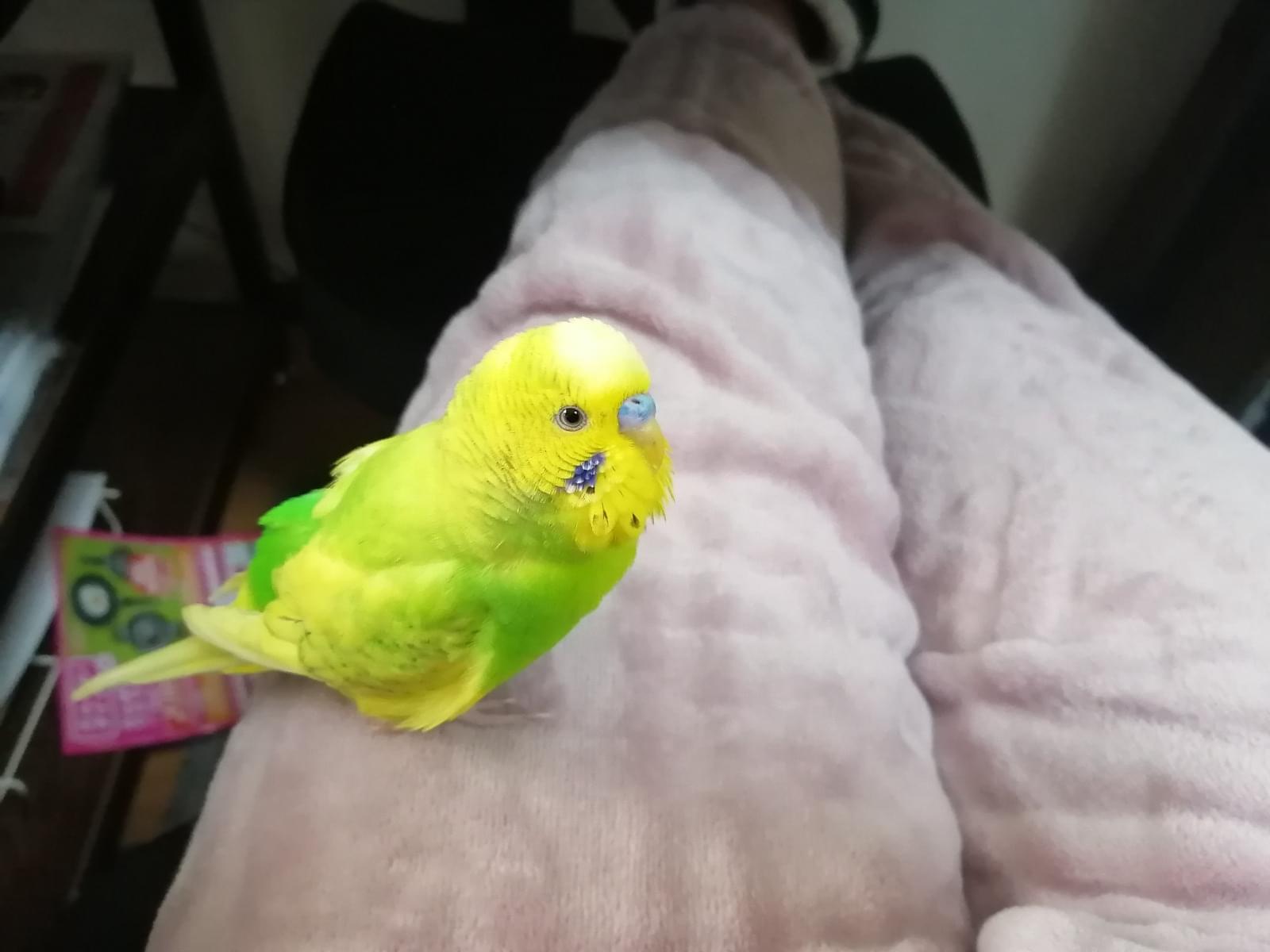 顔は黄色・体は黄緑色のセキセイインコ迷子です