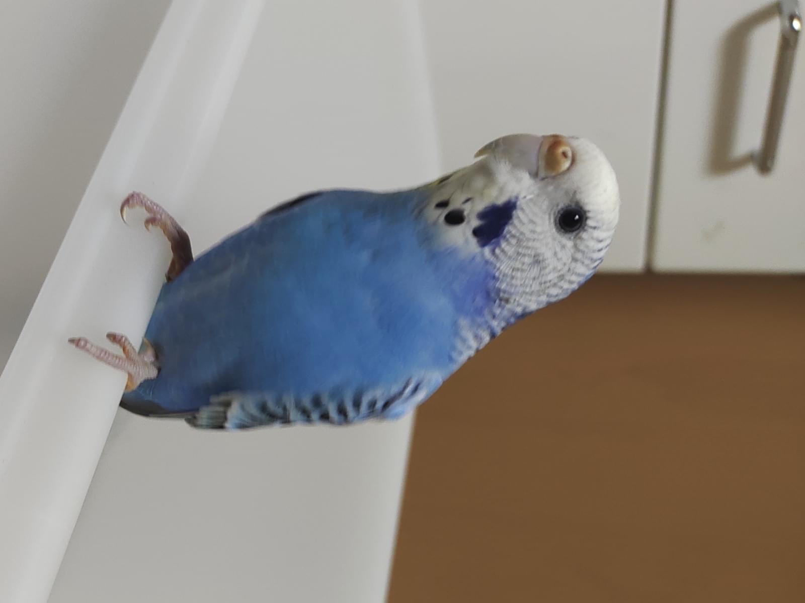 水色のセキセイインコが自宅近くの広場に居て保護しています。