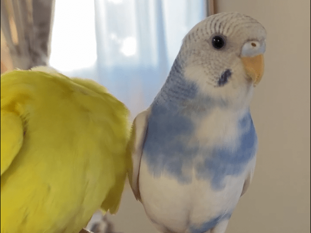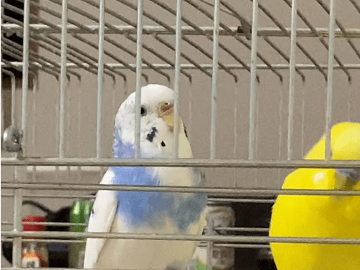 青と白色のセキセイインコです。鼻はピンク色。ほっぺは青色。片方のほっぺの下に黒色の点があります。体は小さめで細めです。声は高めで、身体能力が高めです。カゴの掃除の際に逃げ出してしまいました。
