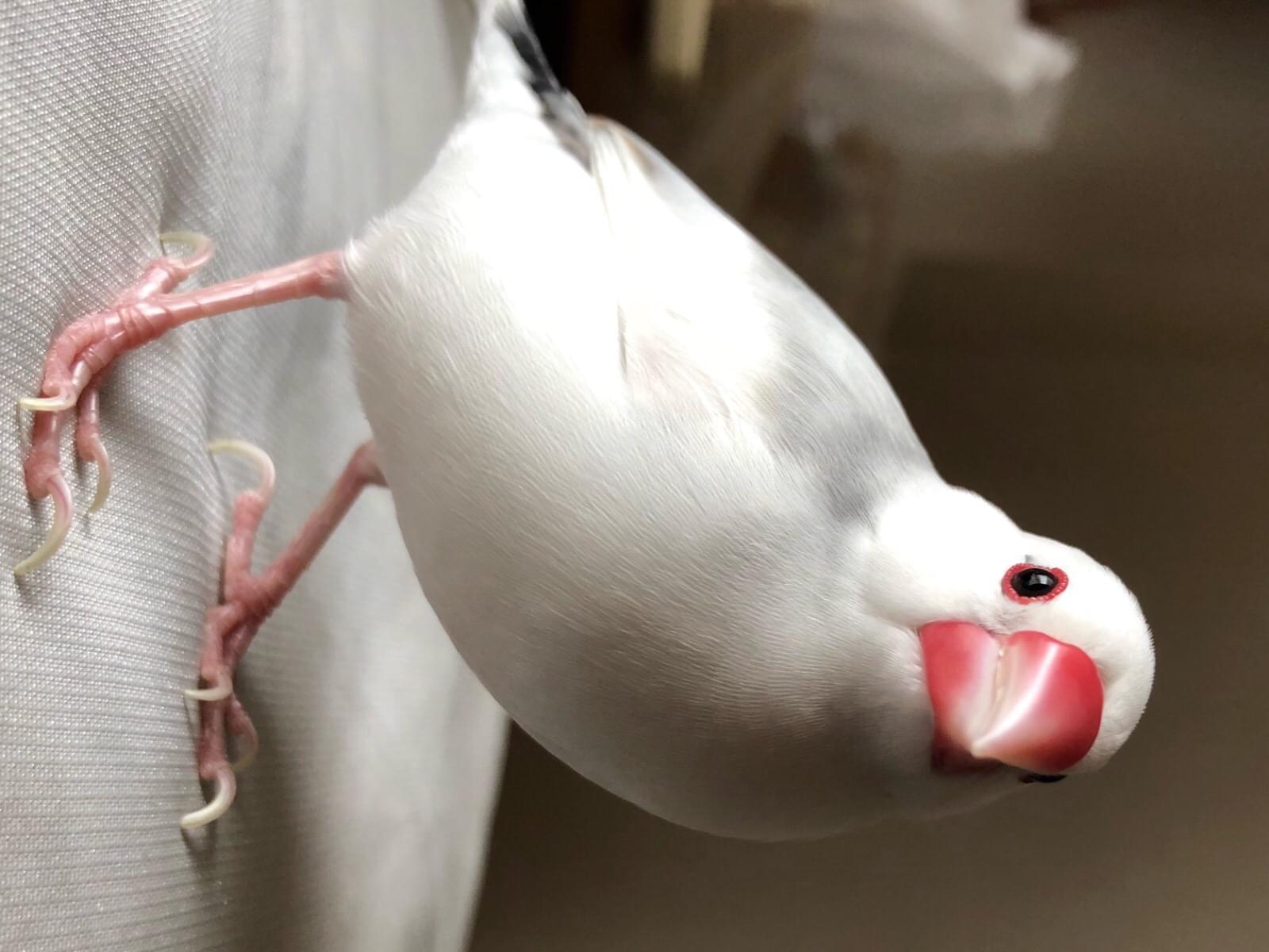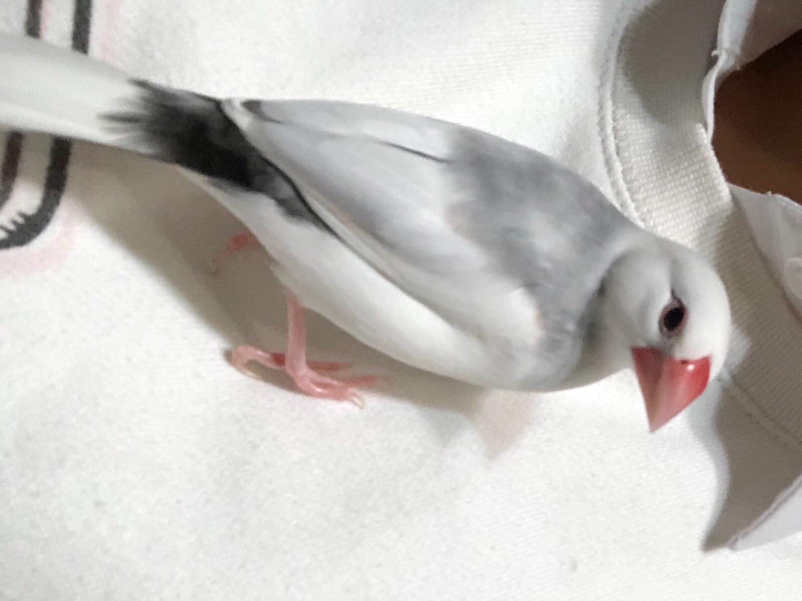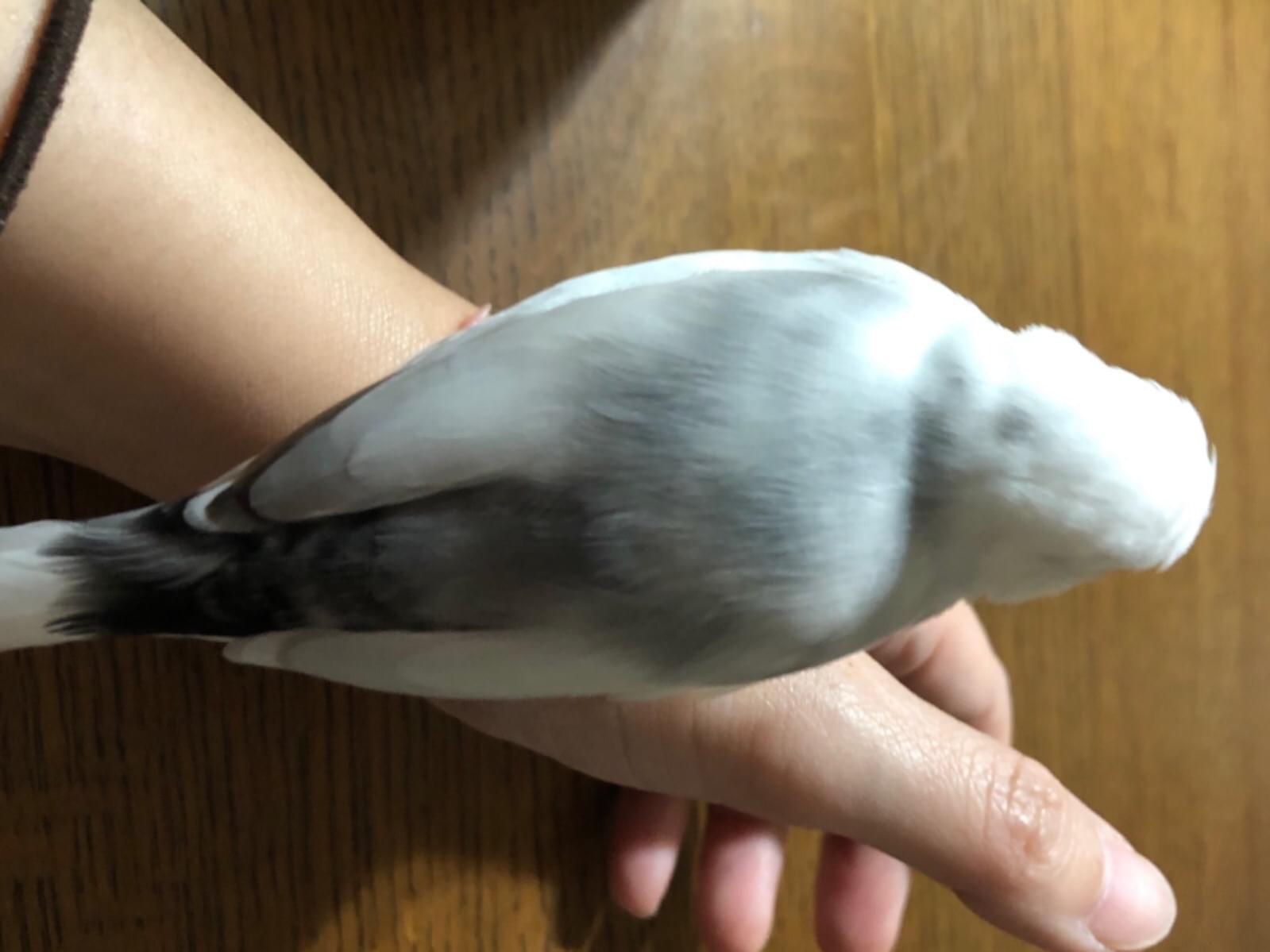 まだ背中や頭に黒い毛が残ってる白文鳥です。