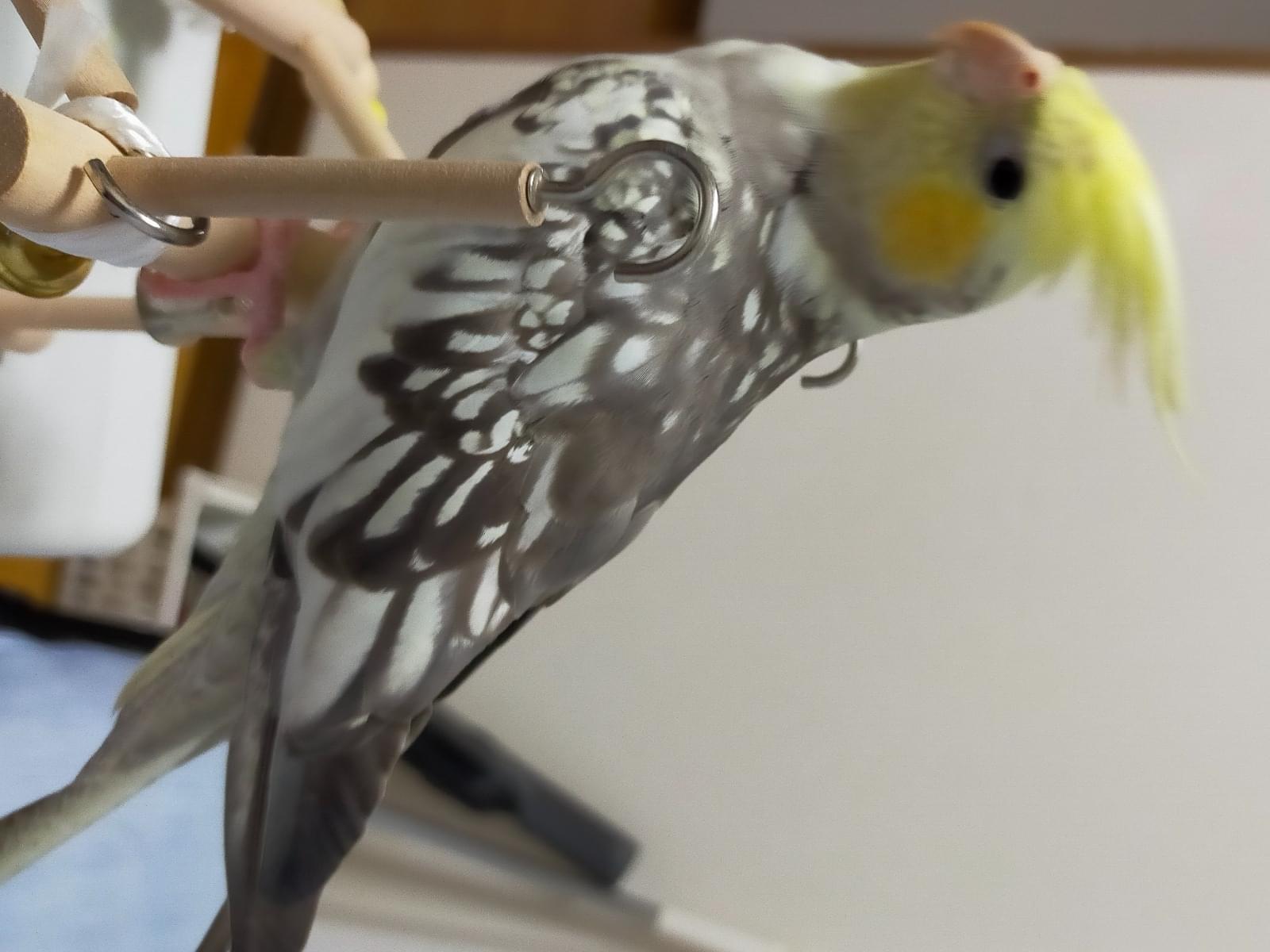 ほっぺのオレンジが薄くて最近、1番長い尾羽が抜けて左右の尾羽しかありません。
