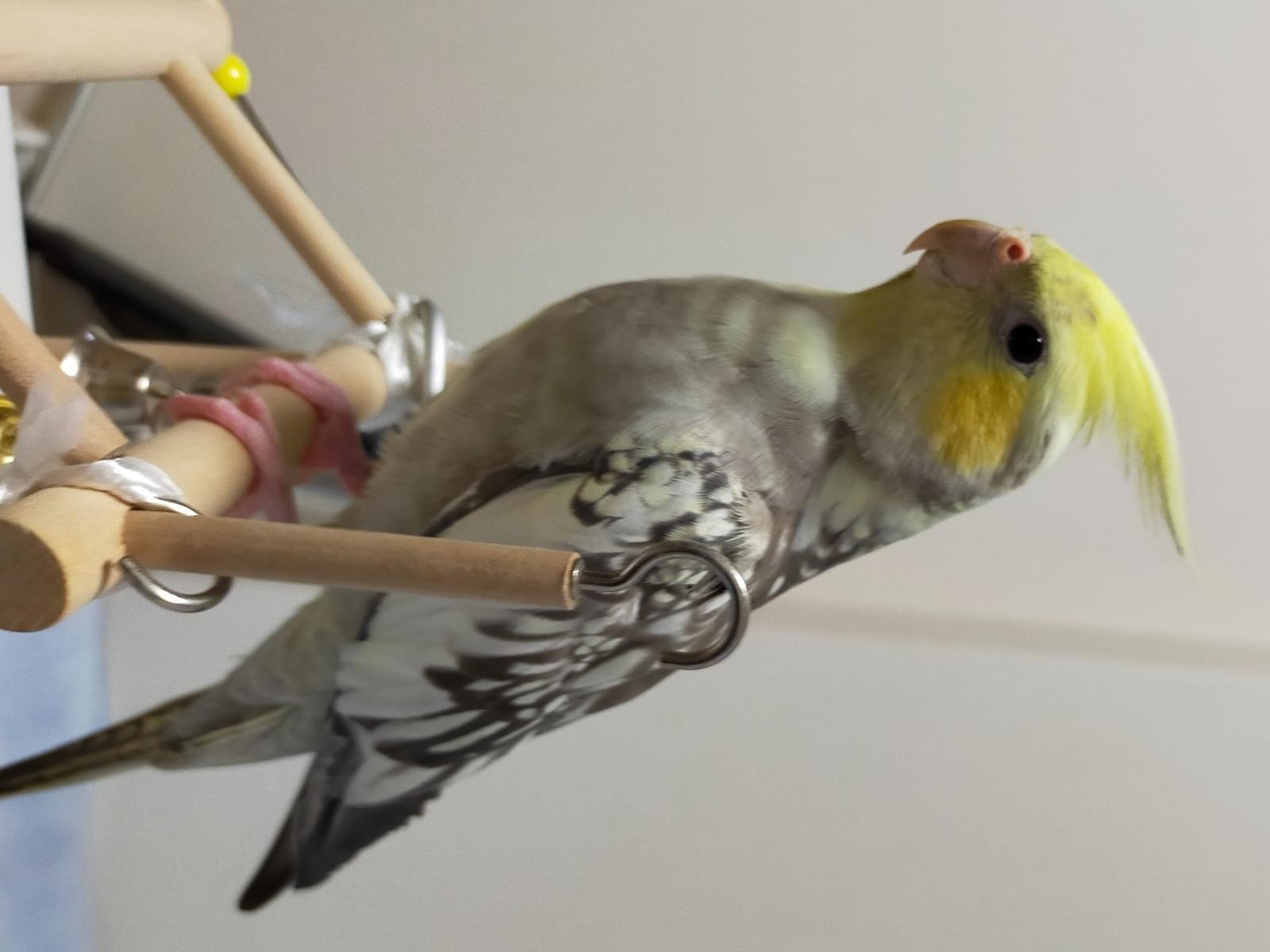1番長い尾羽がないほっぺが薄いオレンジのオカメインコ