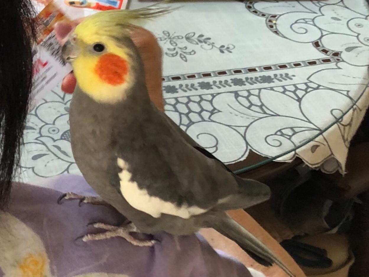 グレーの羽で顔が黄色、頬がオレンジ色です。