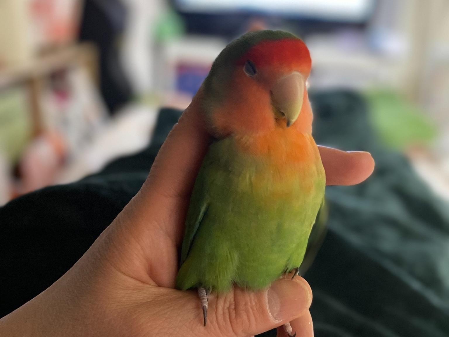 頭が濃いオレンジ、ボディはグリーン、翼に隠れたお尻部分は鮮やかなブルーです。
