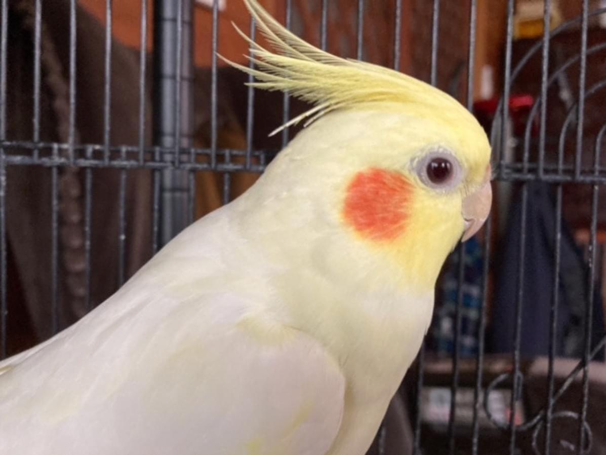 全体は薄黄色でほっぺが赤いオカメインコです。