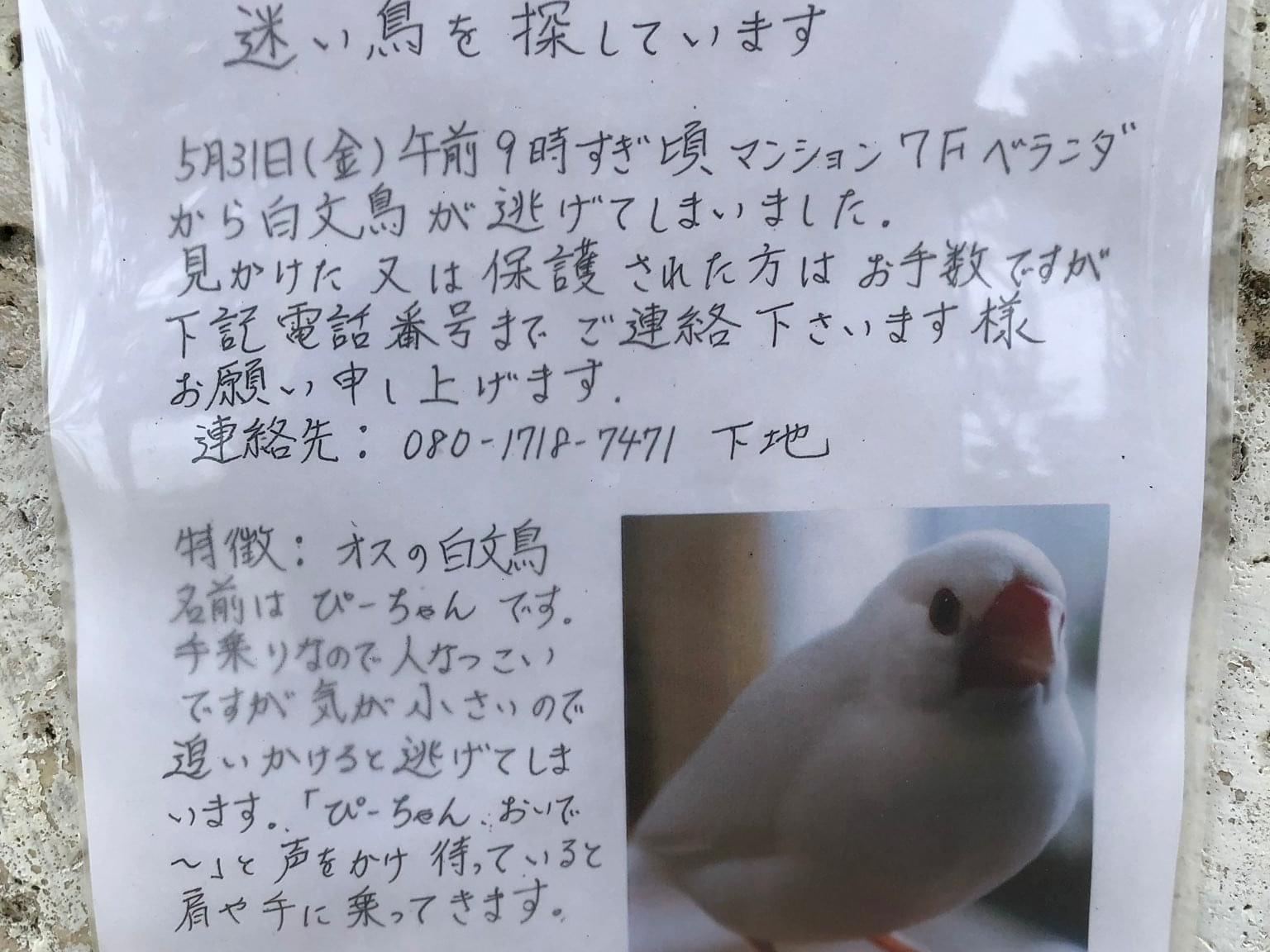 白い身体と赤い嘴が特徴の白文鳥を探してます
