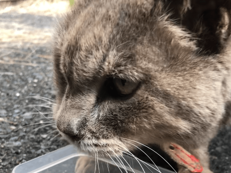 10月18日頃からとある駐車場で見かけるようになり、気になって毎朝と帰りに覗くようにしていたら赤い首輪をつけていることに気がつきました。周辺で飼われていた猫ちゃんかもしれない、怖くて動けなくなっているのではと心配でキャットフードを持って警戒しないように恐る恐る近づいてみると、あまりにもお腹がすいていたのか自らわぉんわぉんと鳴いて近づいてきました。撫でられても平気だったので人馴れしているのかも?もし飼われていた子なら早く飼い主さんの元へ返してあげたいと思い登録しました。