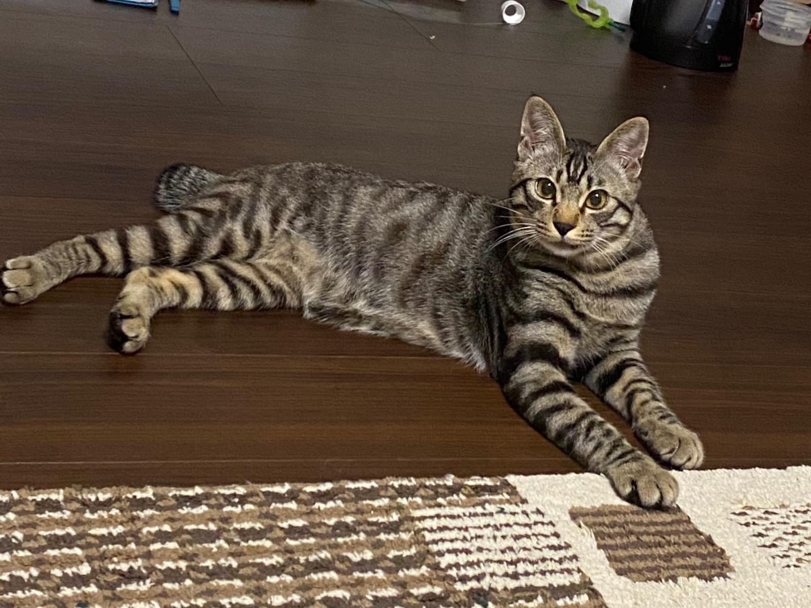 キジトラでオス、立ち耳、しっぽがかなり短く鍵しっぽです。