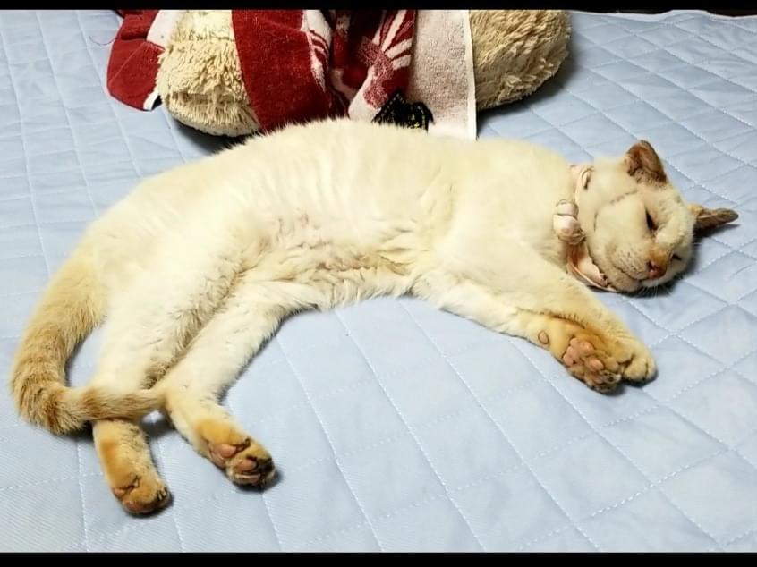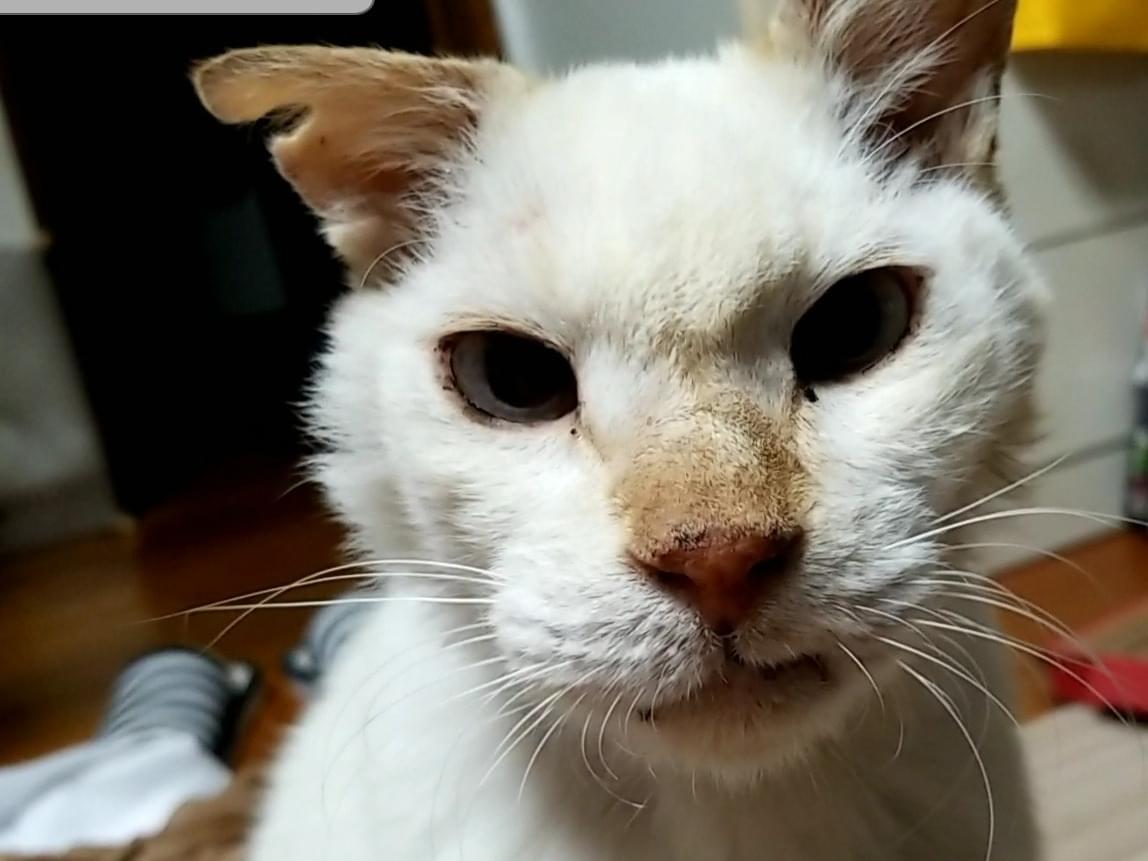 白い毛に、耳・鼻・尾は黄色っぽいです。