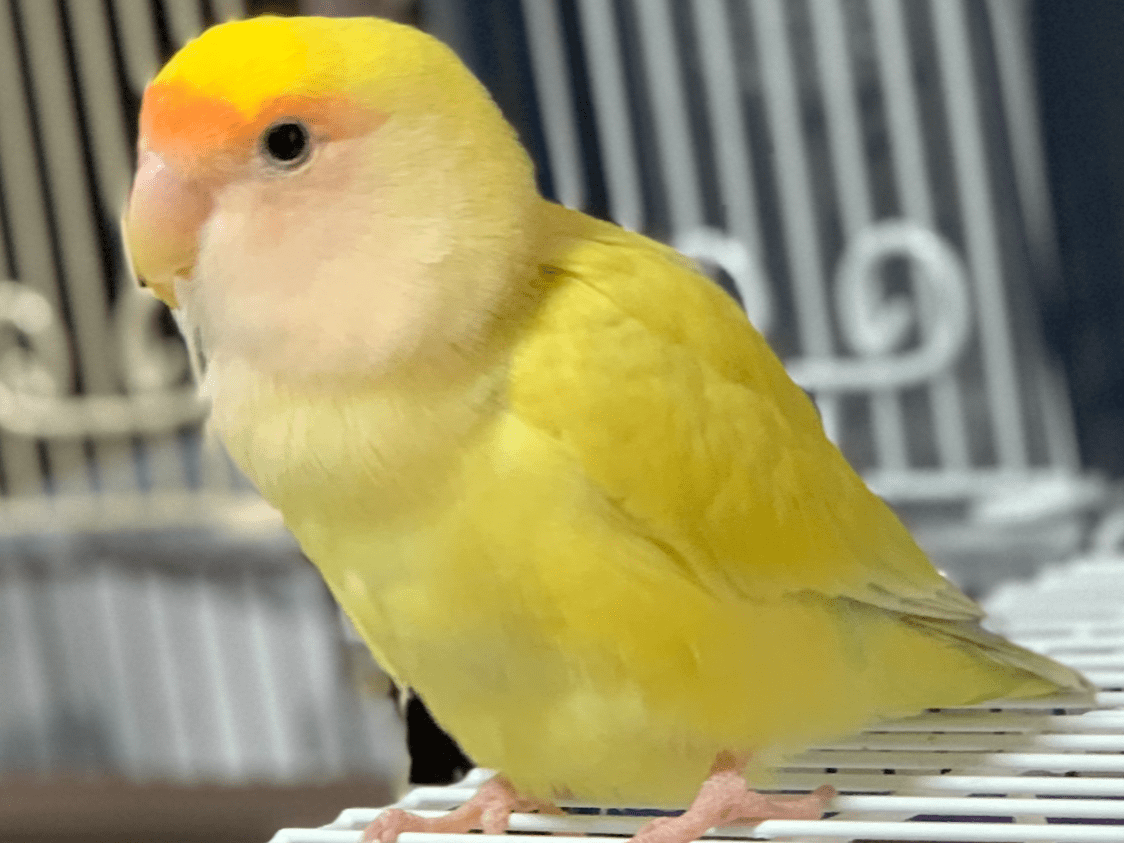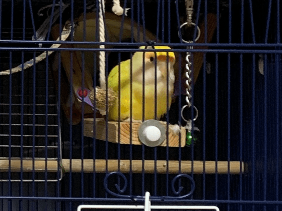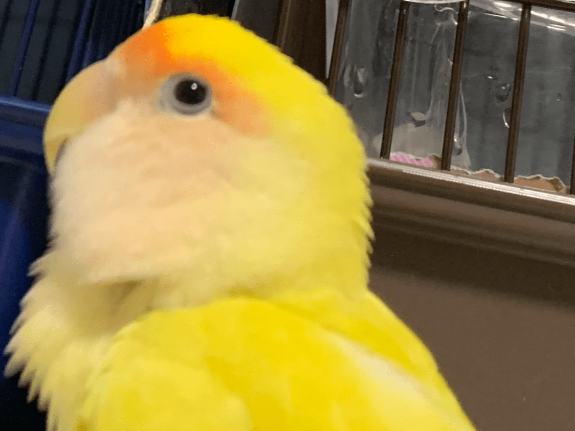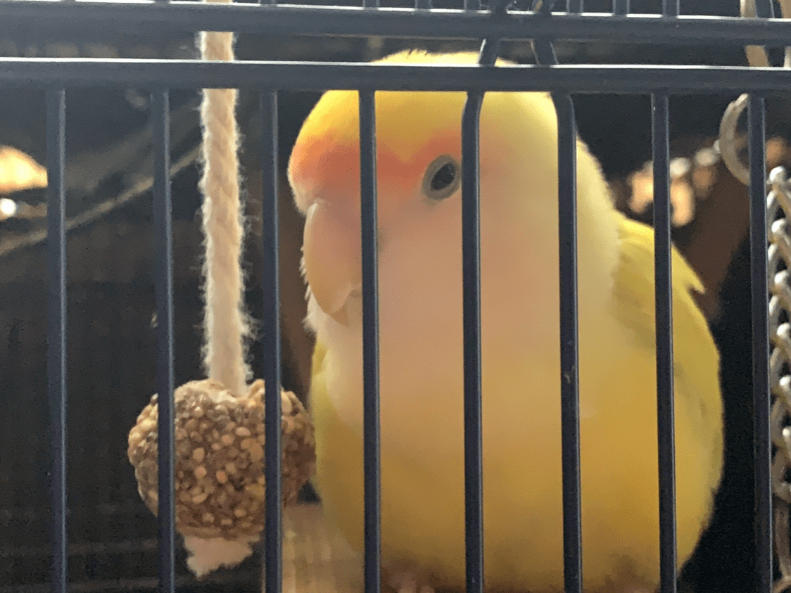 コザクラインコ/黄色い/頭のほうが少しオレンジ色で尾の方が水色です/臆病/鈴が嫌いです