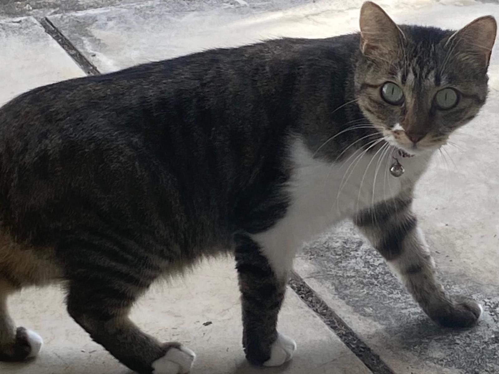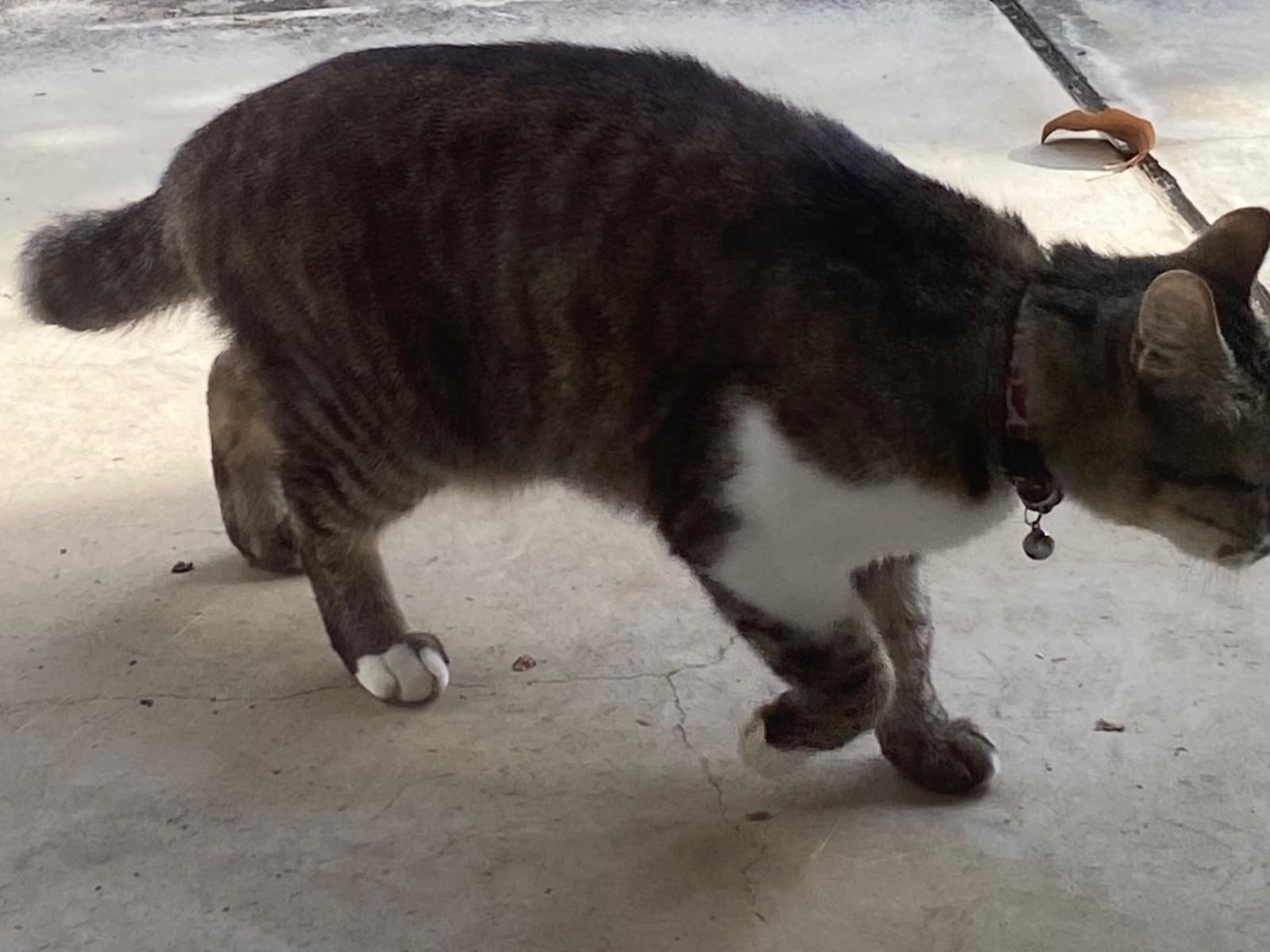 鈴付きの赤い首輪をつけていたので、飼い猫と思われます。