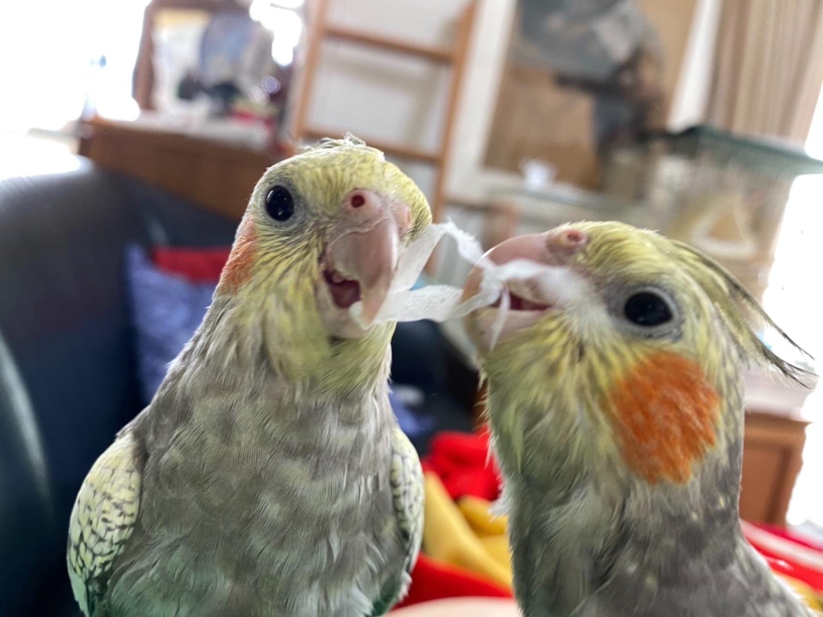 放鳥中、人の目があると安心して遊びますが姿が見えなかったり移動しようとすると不安になってくっついてきます。