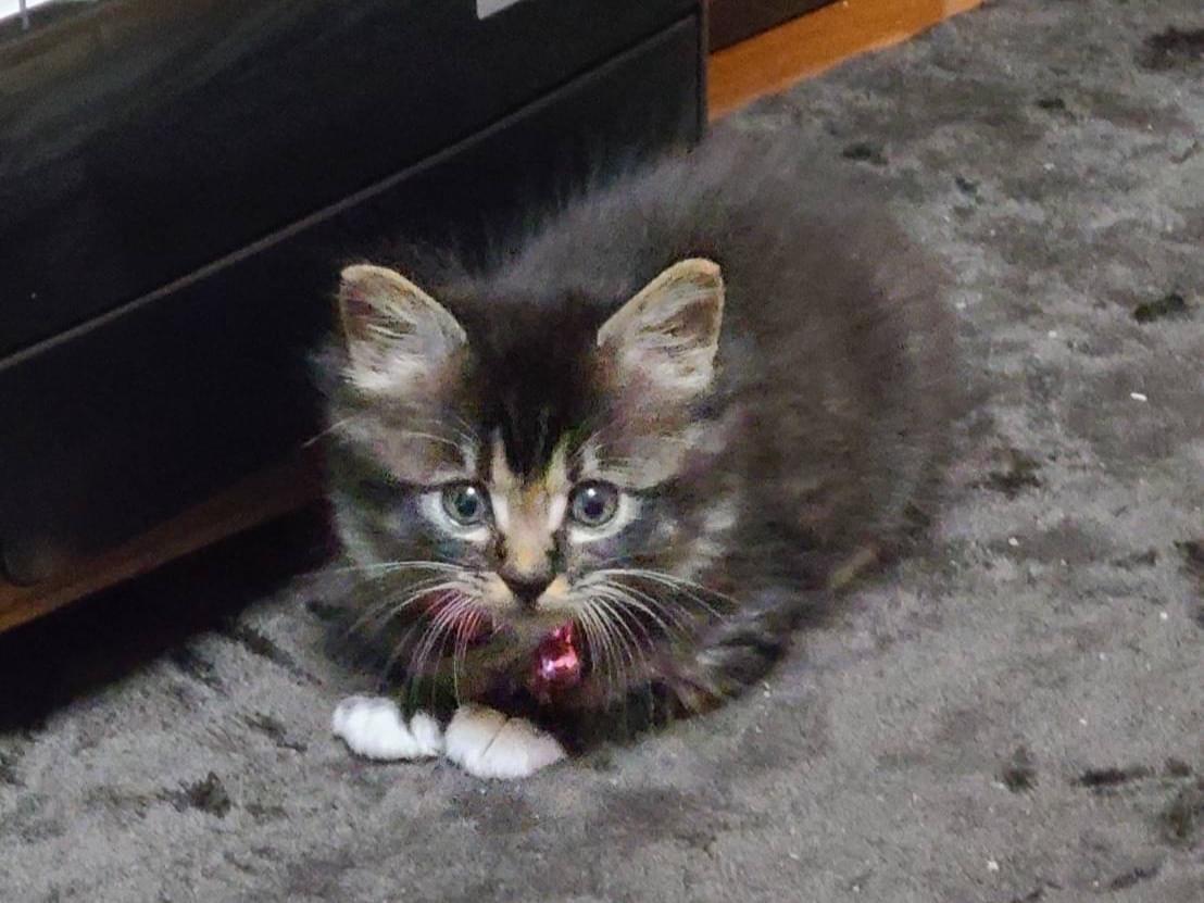 全体的にグレー色で、ところどころ茶も混ざっていて、足先だけ白いです。