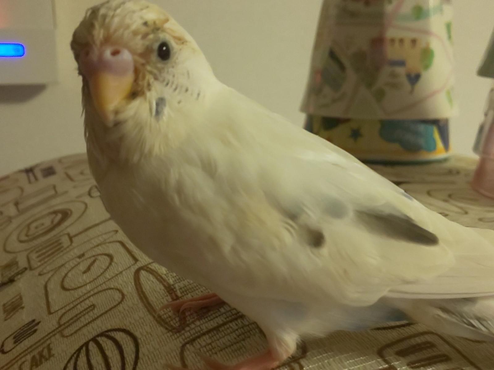 色は白で、羽とおしりが少しだけグレーと水色です。