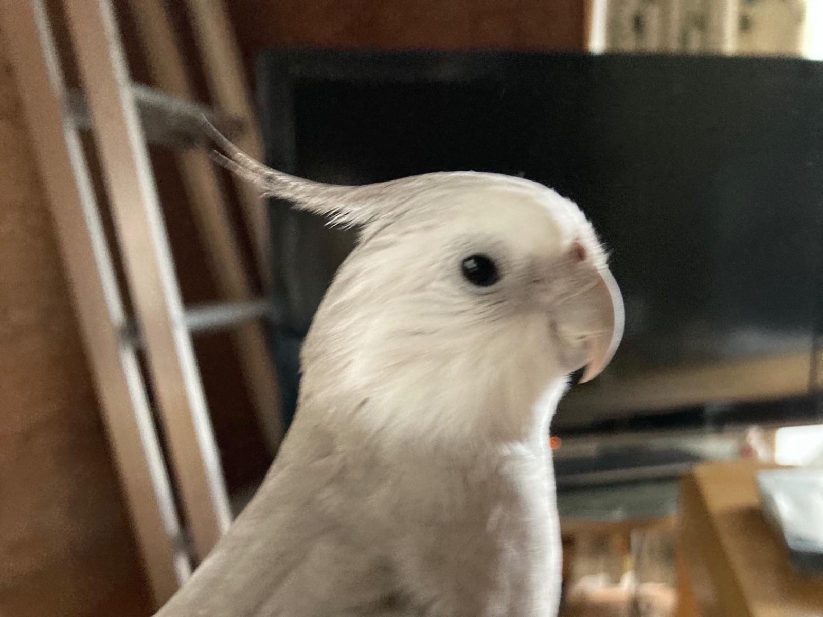 体は灰色っぽくてオカメインコの特徴のチーク(ほっぺ)は真っ白です。冠羽が生えています。