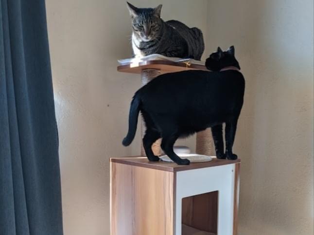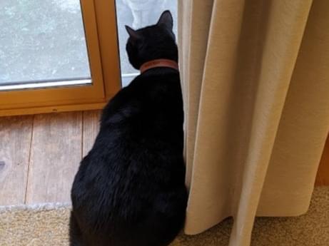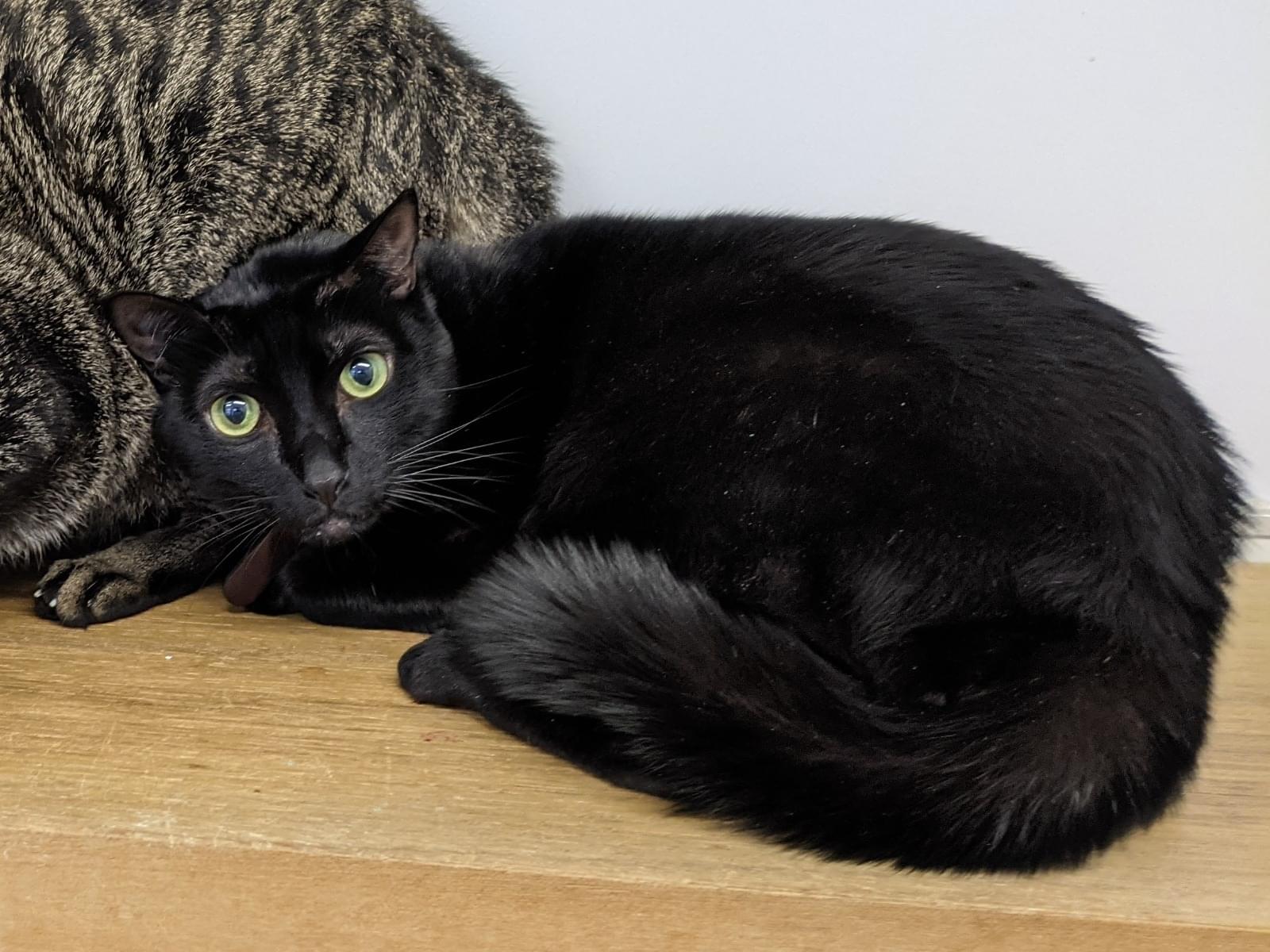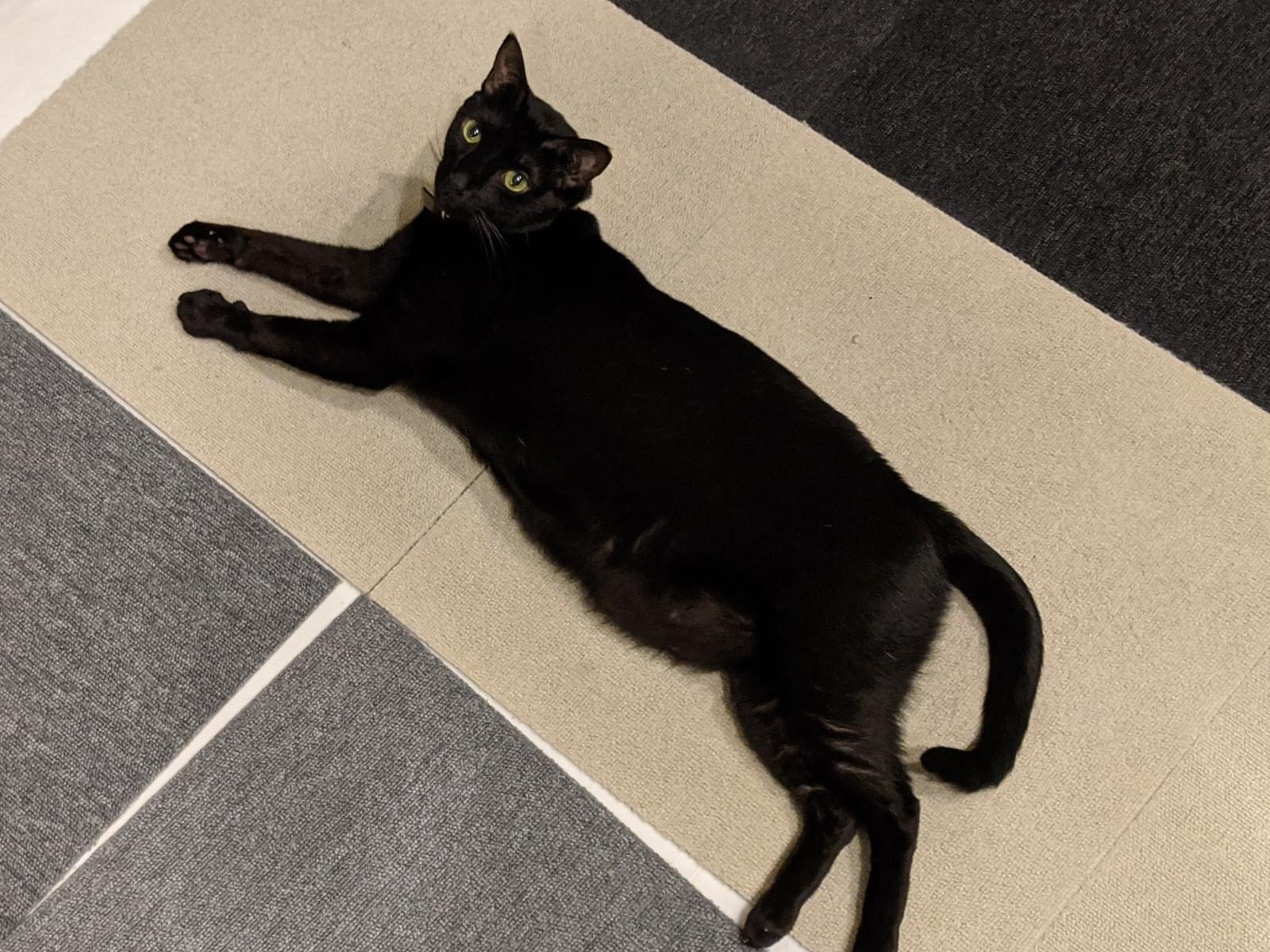 オスの黒猫、左耳(向かって右耳)に直線のカット(去勢のしるし)あり、体重6−7kg、お腹がルーズスキン、名前の入った茶色い首輪をつけています。人とは距離を取るタイプで、高い声で鳴きます。同居猫(双子の兄)と喧嘩して飛び出してしまい、帰ってきません。1歳で去勢しましたがオスの習性が残っており、メスを求めて遠出している可能性もあります。