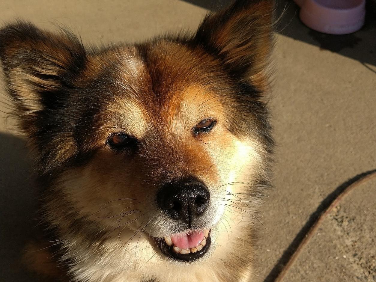 茶多めで白混じり、手先尾先が白。シェルティと似たような毛色。毛はセミ長毛