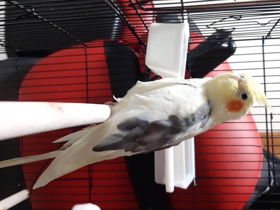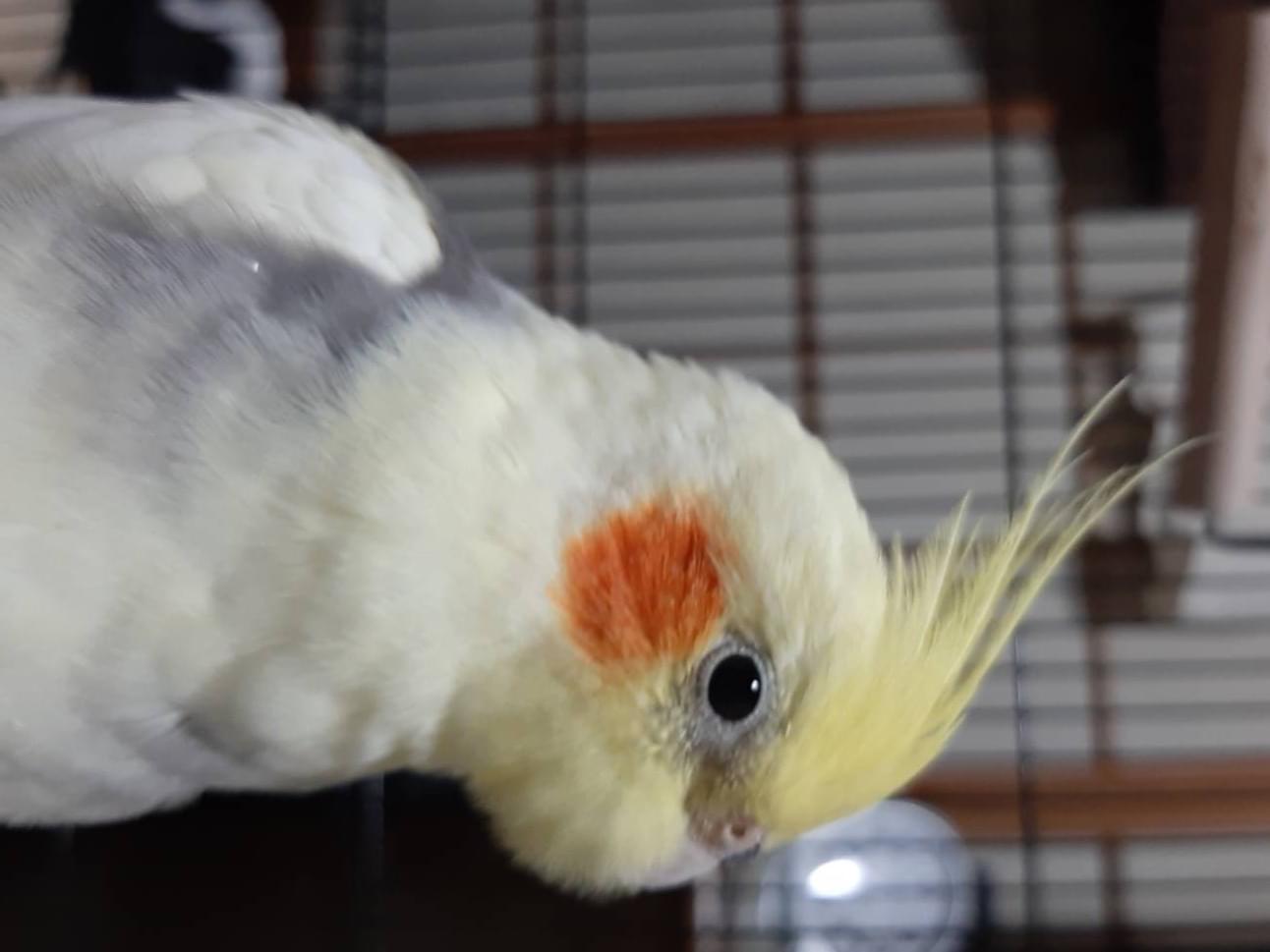 全体的に白、羽が一部グレー、肩に乗るのが好きみたいです。
