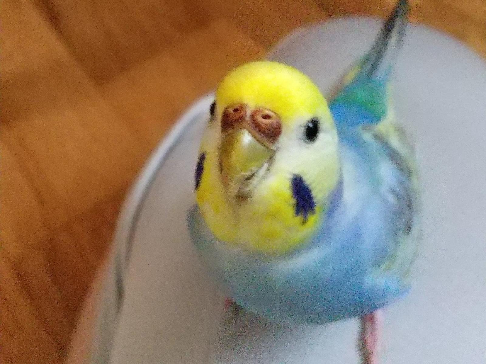 アオちゃんの鼻は褐色で羽は片方は伸びてて片方はカットしてから伸びてません。左右対称の長さです。