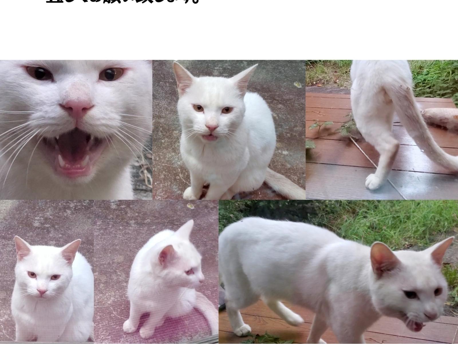オスの白猫で、しっぽの部分が少しグレーがかっています。