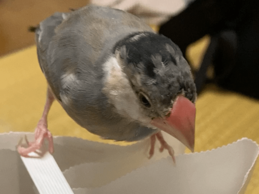 毛の生え変わり途中で、背中はグレー、頭は黒色で白い大きな丸型模様があり、胸元に黒い大きな丸型模様があります。人懐っこく肩や頭によく止まります。歌が上手でよく歌います。運動神経がいいためとても素早く飛びます。