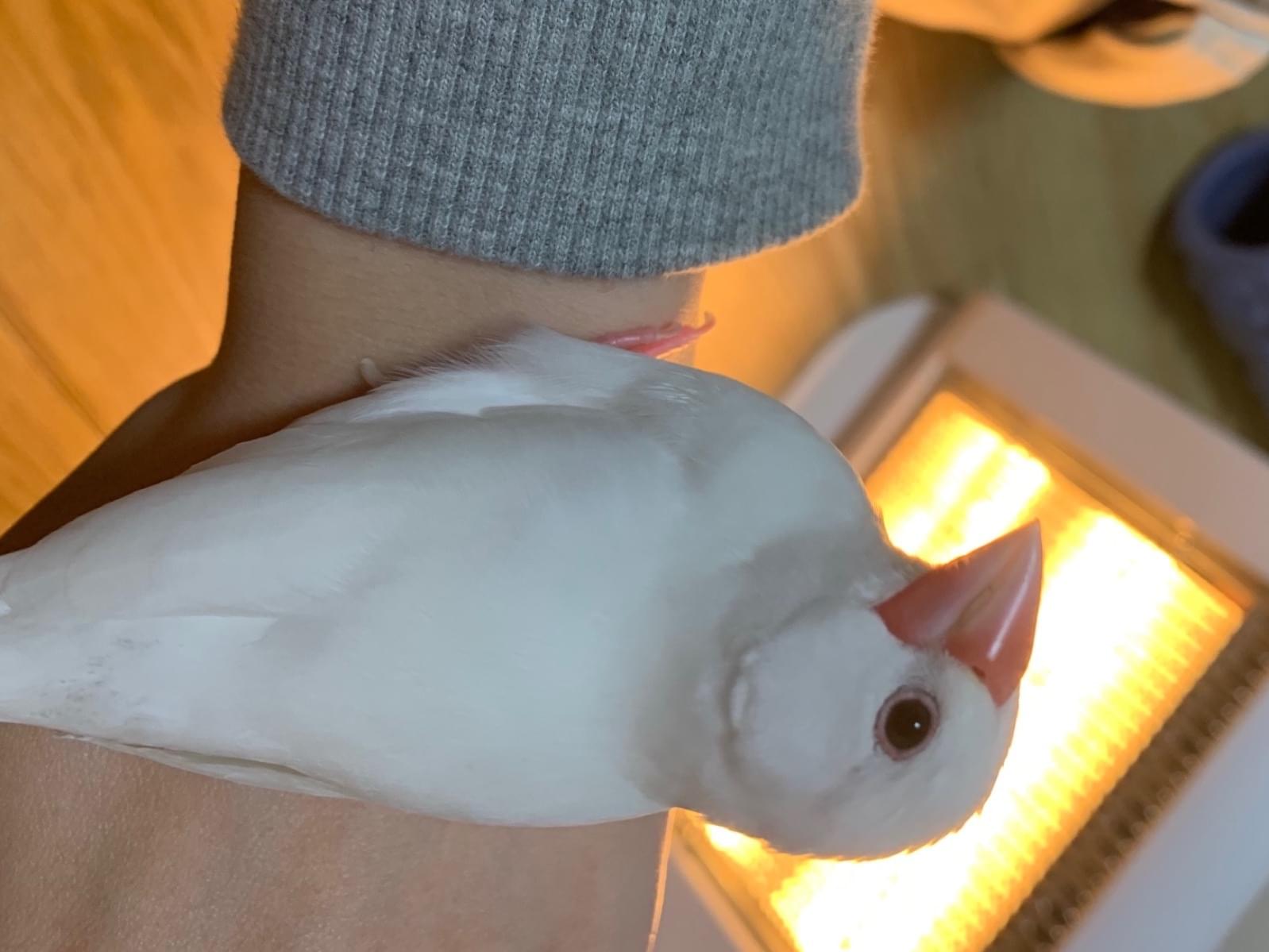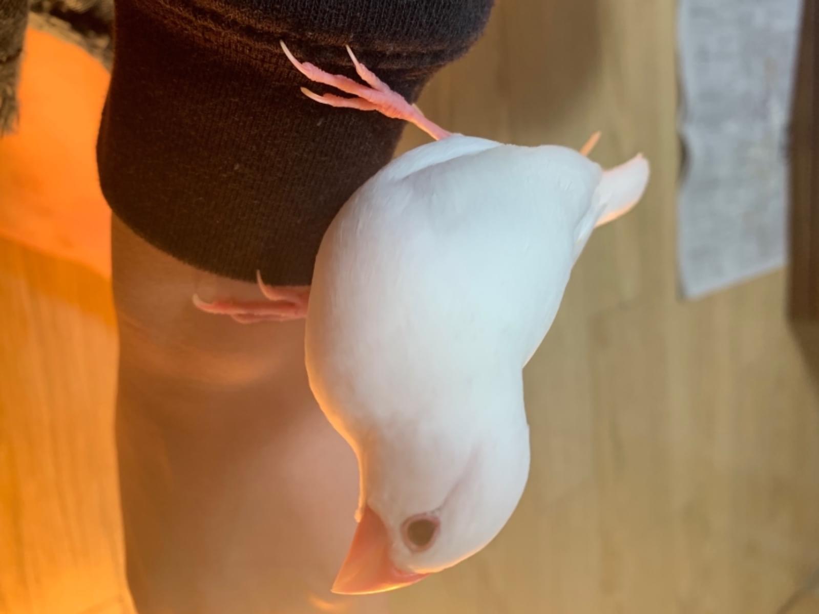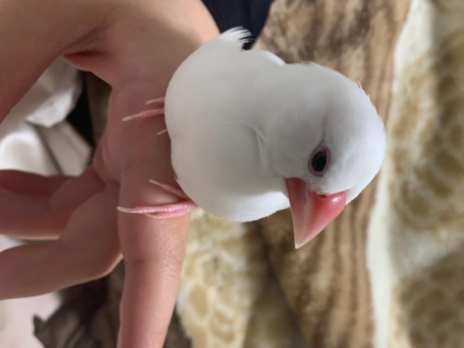 白文鳥。羽の間の尻尾の付け根付近に薄く黒い点々の模様あり。