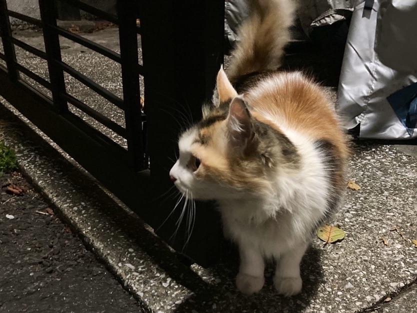 綺麗な毛並みの長毛種、首輪あり、すぐに撫でさせてくれるほど人懐っこく飼い猫であると思われます。