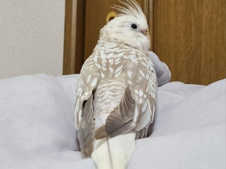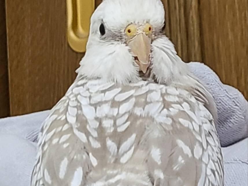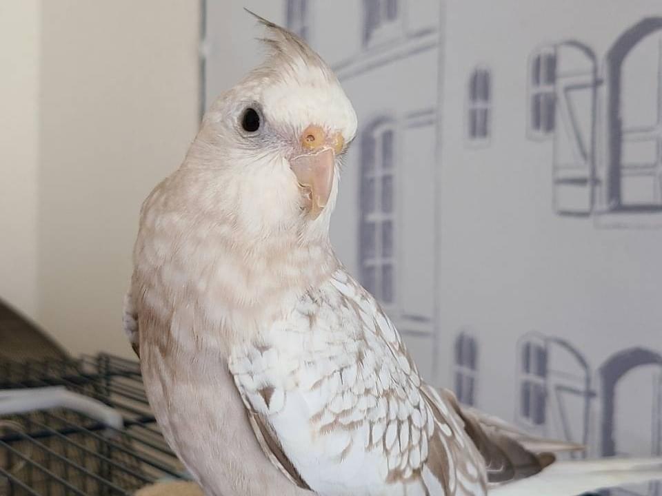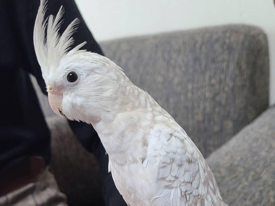 色は白色と灰色です。種類はオカメインコのホワイトフェイスシナモンパールです。性格は、甘えん坊です。まだ5ヶ月で30cm程の大きさです。カラスよりは小さいです。