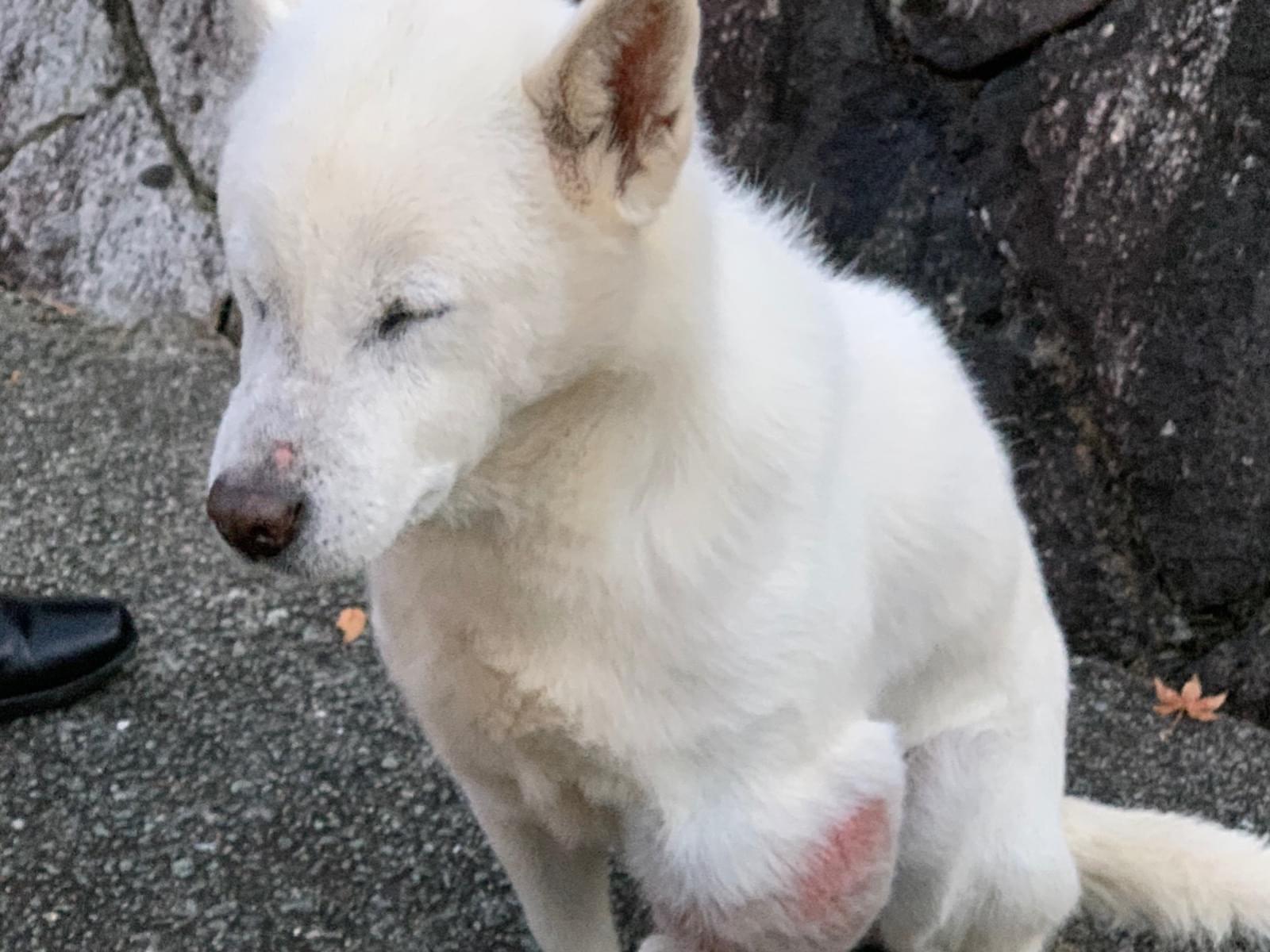 白犬、保護!左前足にコブあり。