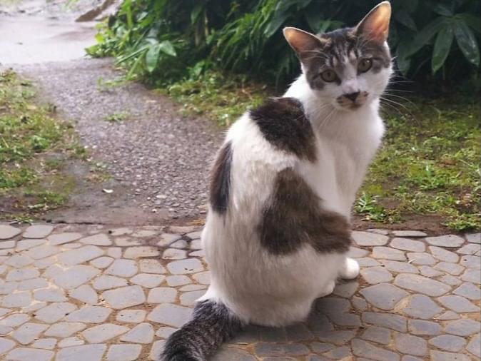 ピンクの首輪を着けた白とグレーの猫を探してます