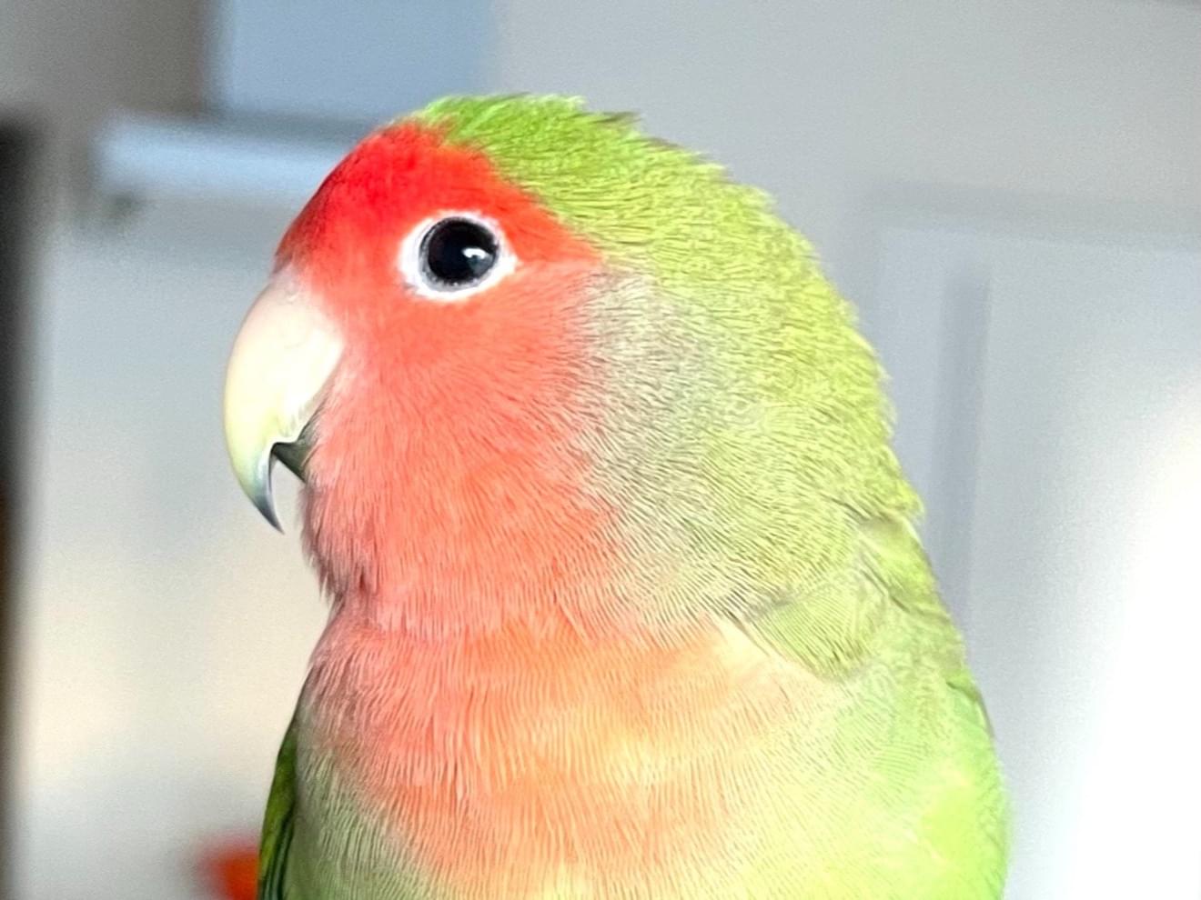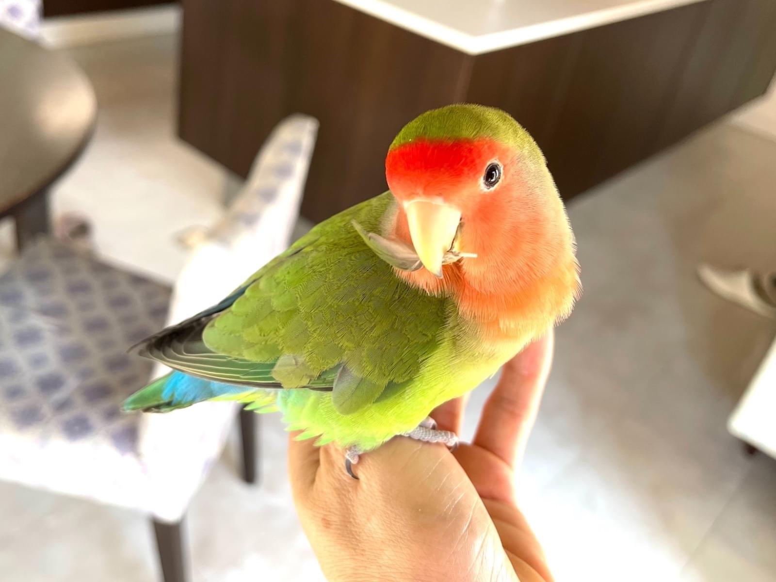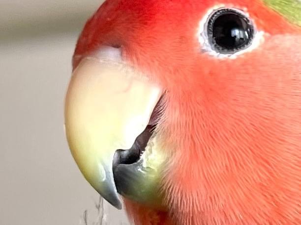 体は緑色、顔はオレンジと赤、腰はブルー、くちばしは黄色で先端は黒です。
