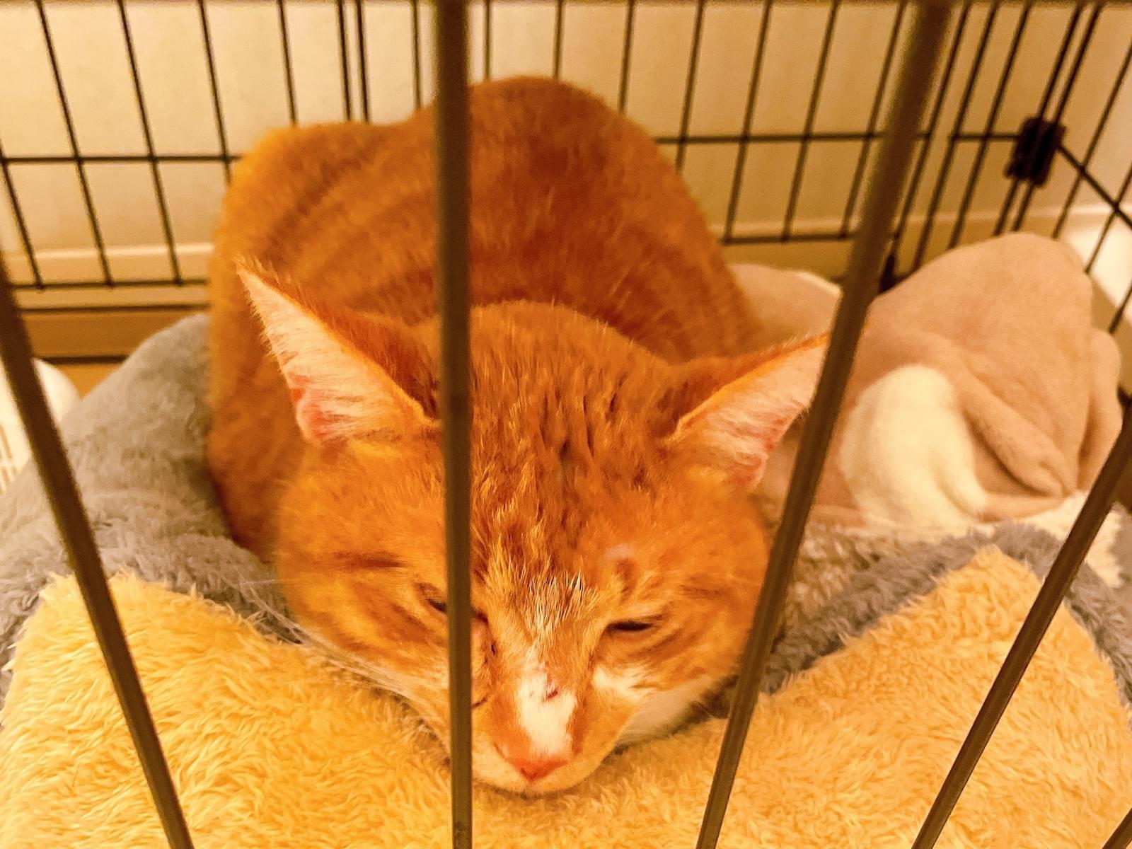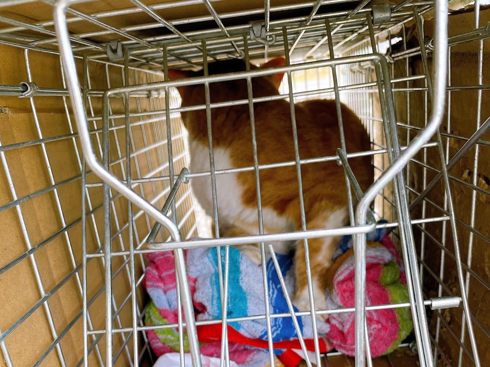 飼い猫捜索のための捕獲器に入っていました。四肢と尻尾の先が白い、狐のような体の猫です