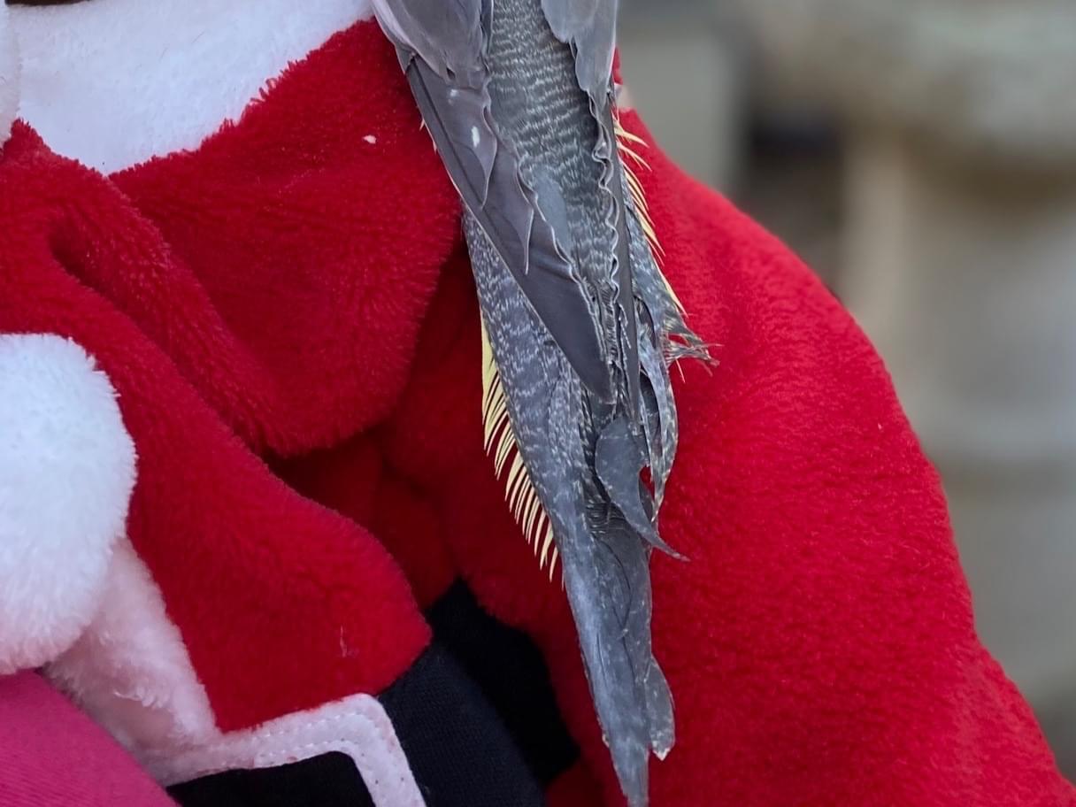 普段家の中では飛ばないのですが、勢いよく飛んで行ってしまいました。人に慣れているので、手を出せば乗ってくると思います。尻尾の部分が少し変な風になっています。
