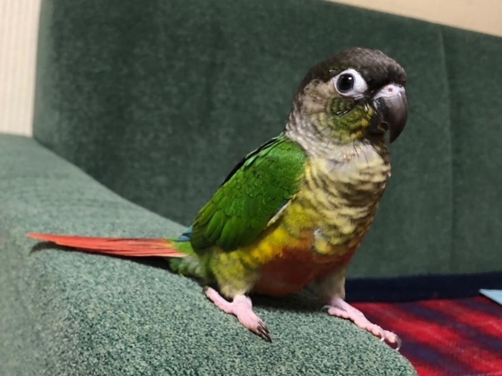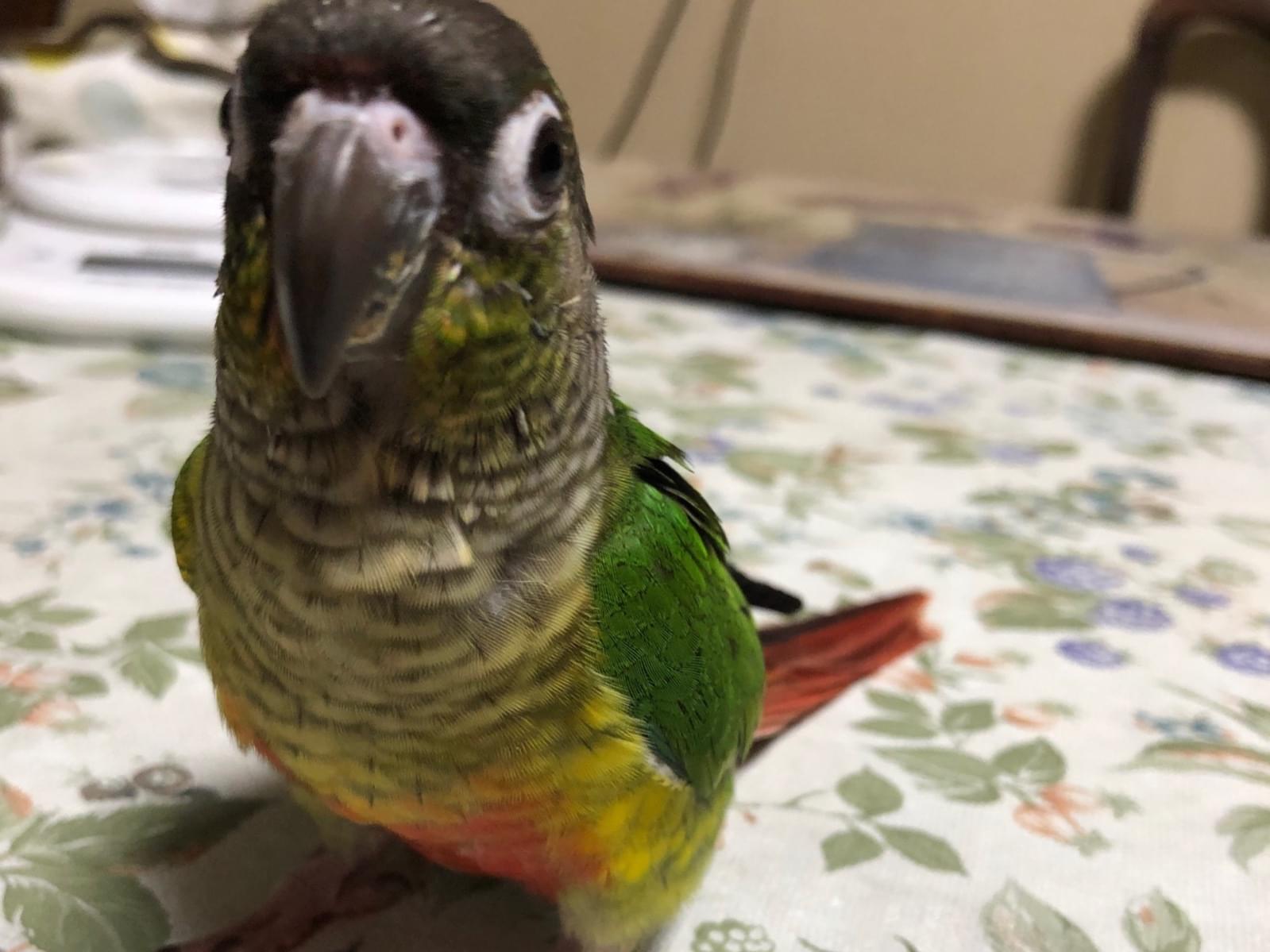 背中全体は緑色、お腹と尾は赤色、脇は黄色の羽です。「ベルちゃん」「ピーコちゃん」と話します。電子レンジや水の音に反応してピーピーピーと鳴きます。人懐こく肩や手に乗ります。