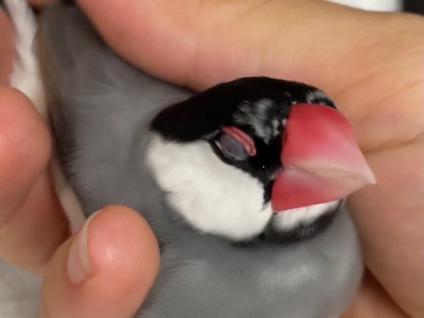頭からくちばし近くに白いゴマが入った桜文鳥です。