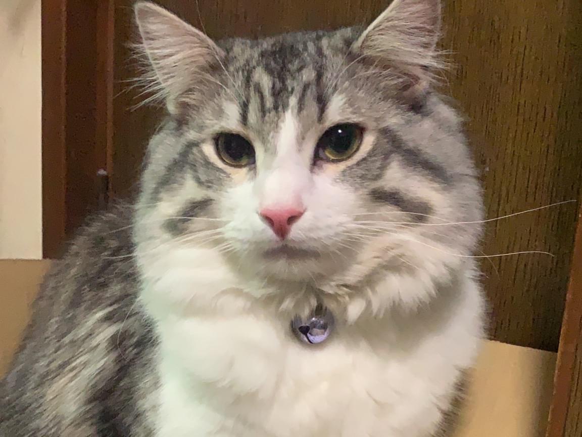 特徴:声が小さくほとんど鳴きません。おなかの左側に茶色い毛が少し。しっぽは長くてふさふさ。からだは大きく、顔は小さいです。