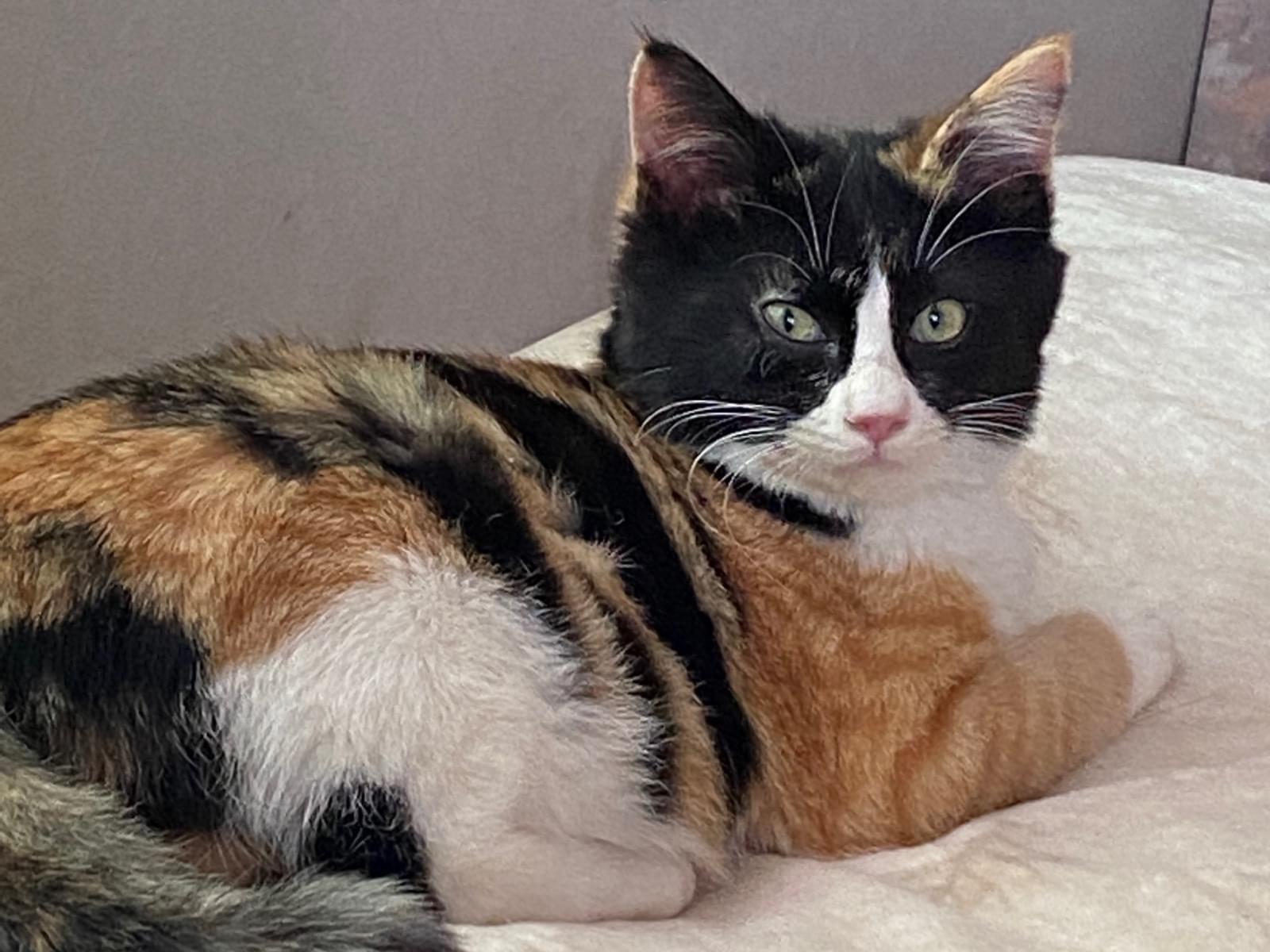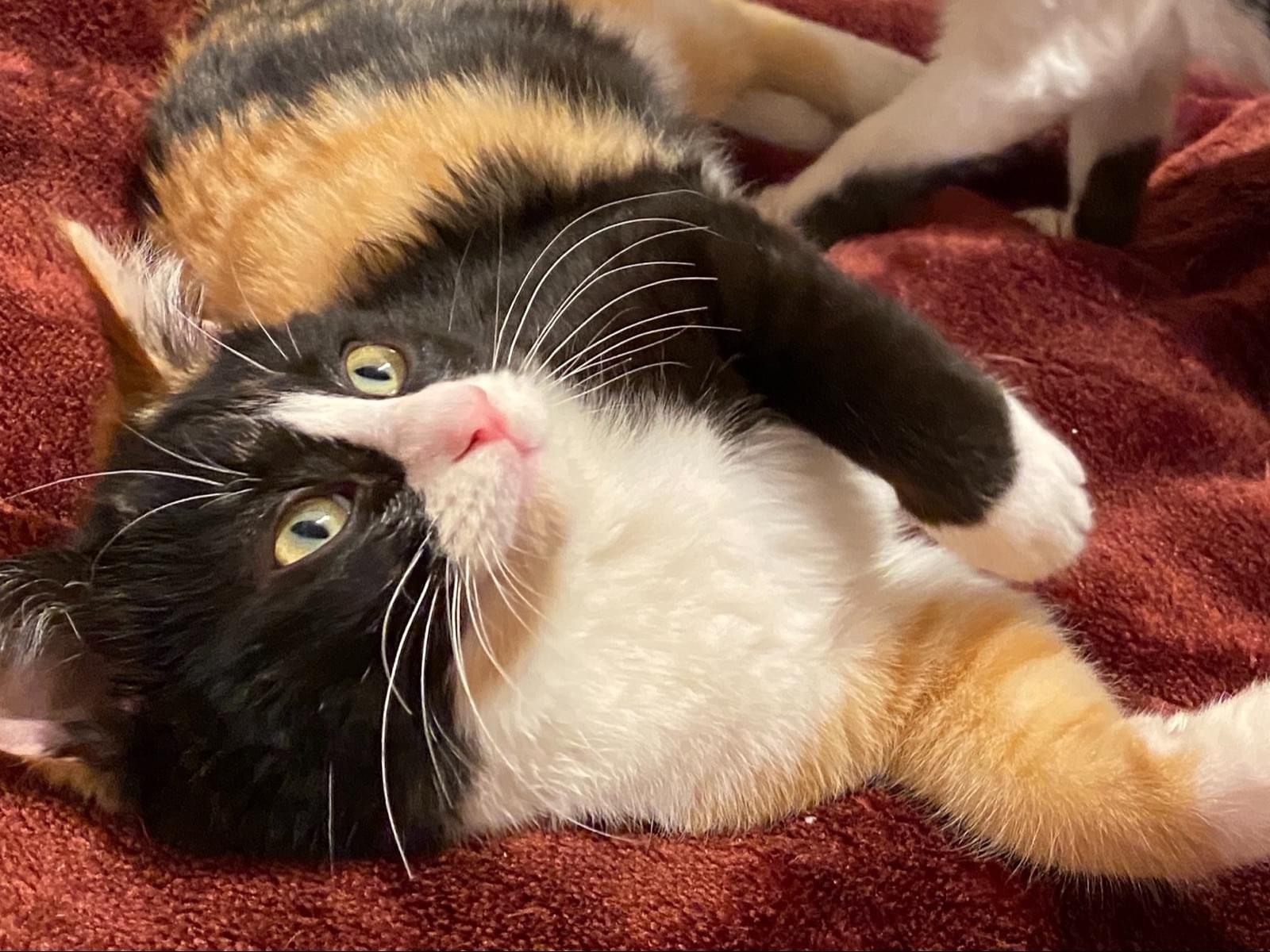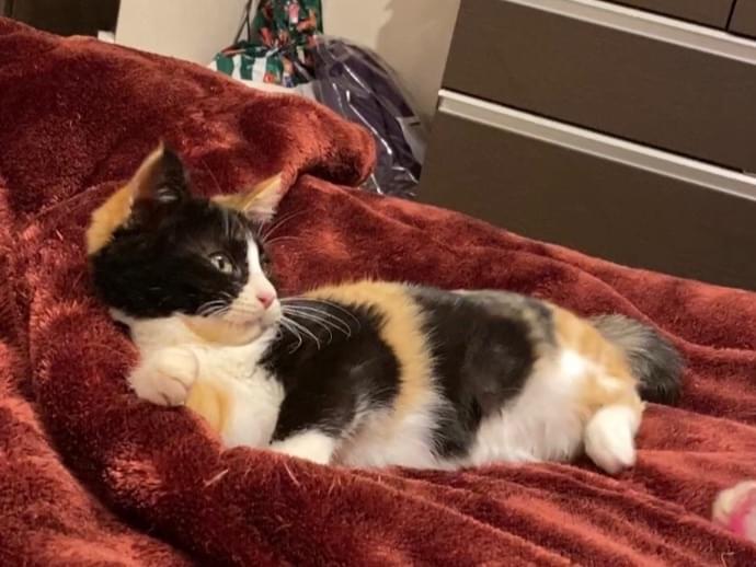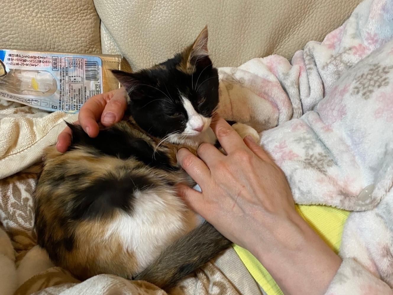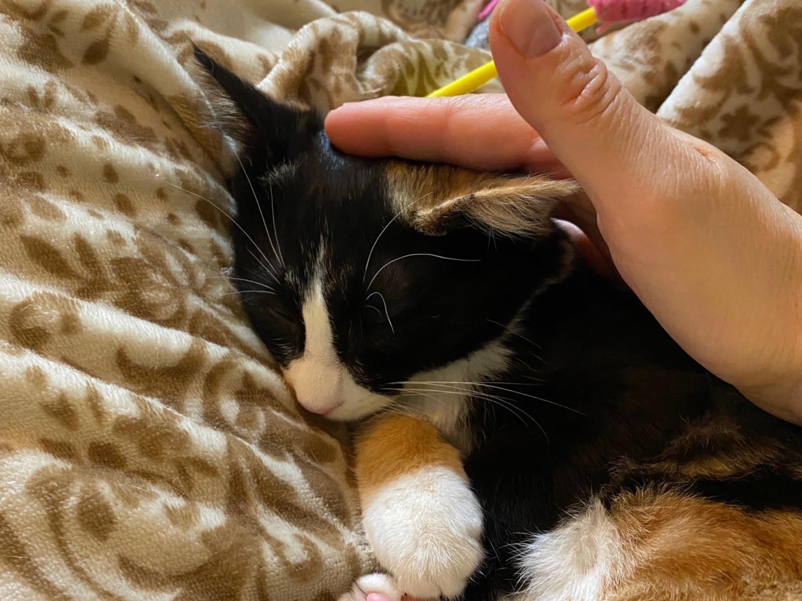 可愛い三毛猫の女の子。保護してから1ヶ月経ちまして、ビビリから甘えん坊になりました。