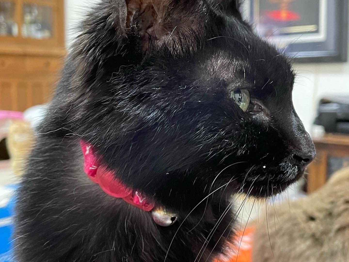 2021年12月12日の夕方、自宅玄関から出てしまいました。約2キロと痩せている黒猫です。鈴付きの赤い首輪をしています。外れていても、首輪の跡が残っています。尻尾は約7センチくらいと短いです。毎日家族全員で必死に探しています。クロは大切な家族です。どうかよろしくお願いします。