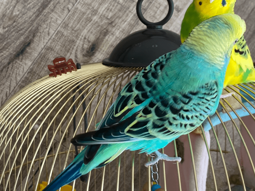頭が黄色で身体がエメラルドグリーンの男の子のセキセイインコが迷子になってしまいました。