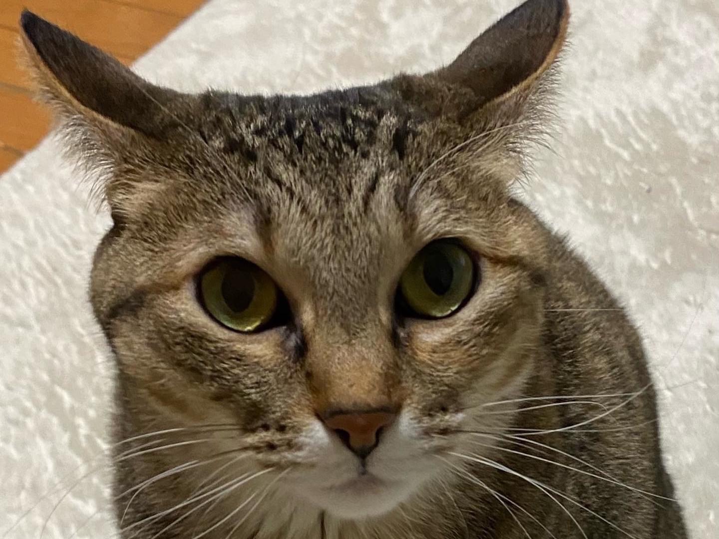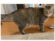 キジトラ、首輪なし。避妊済みのメス。脱走当初は大きめのぽっちゃりでした。