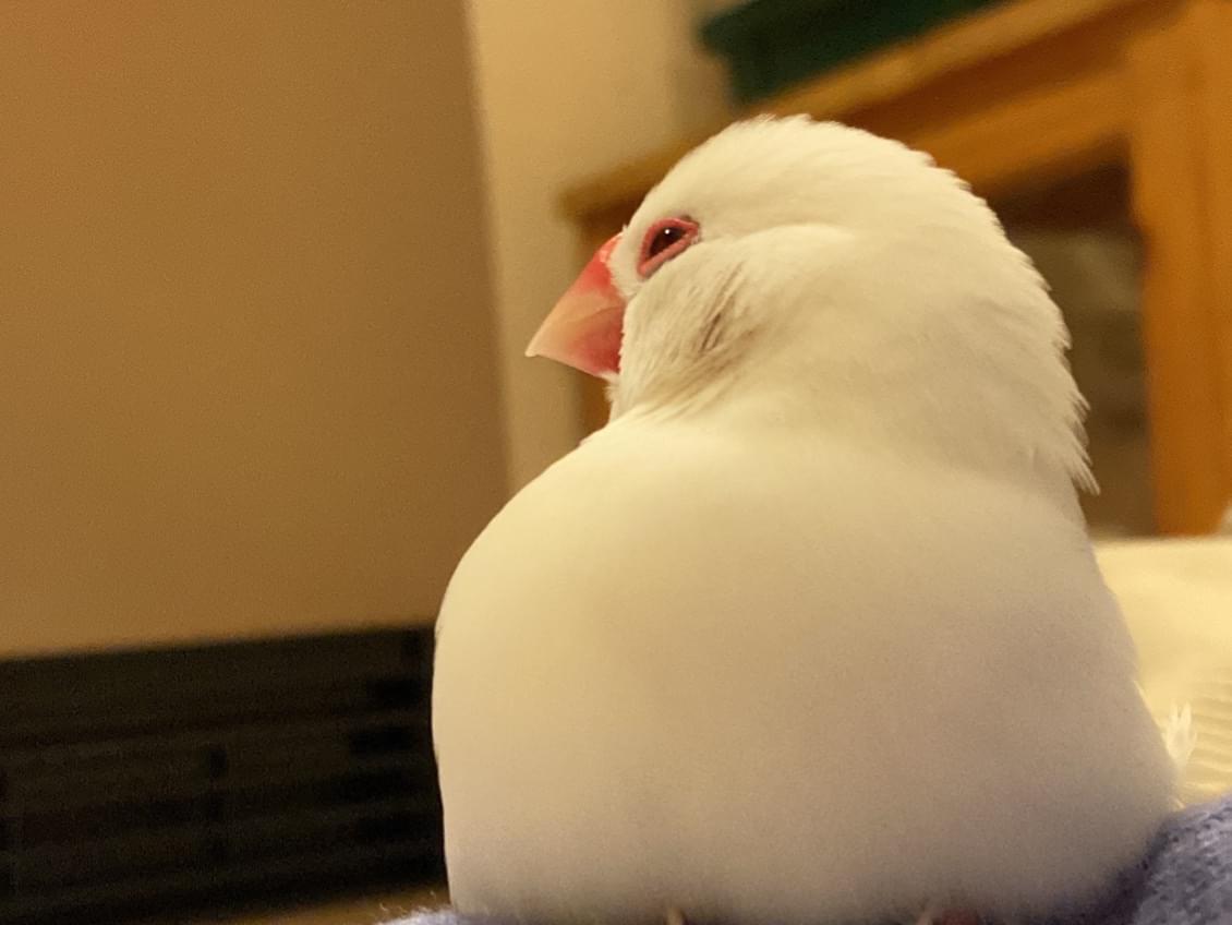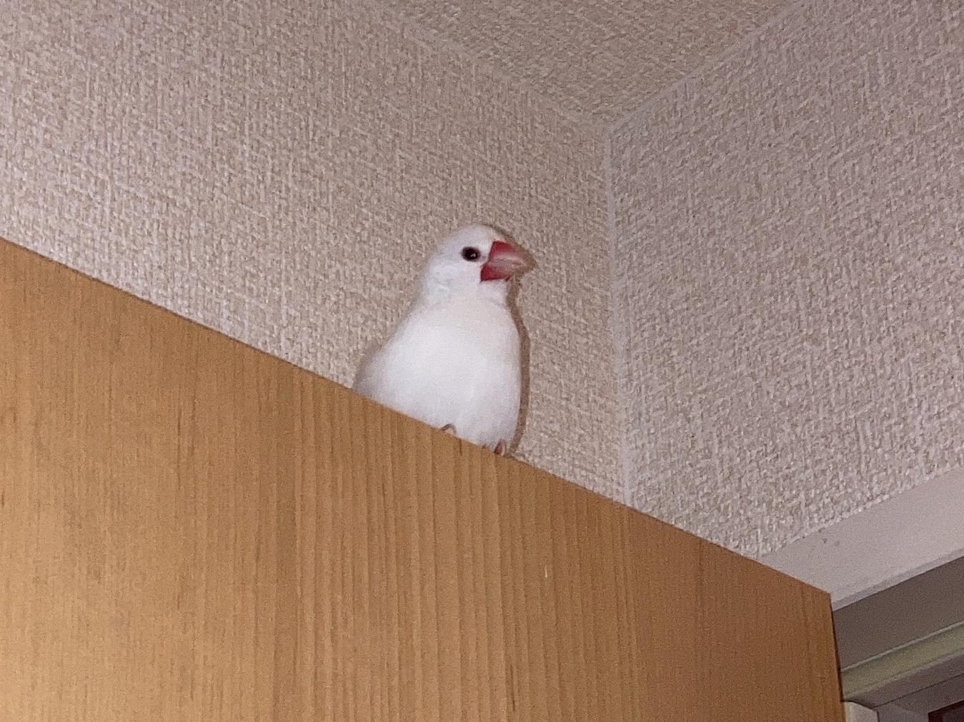 白くて嘴はピンクの文鳥です。ドアから飛び出して迷子になりました。