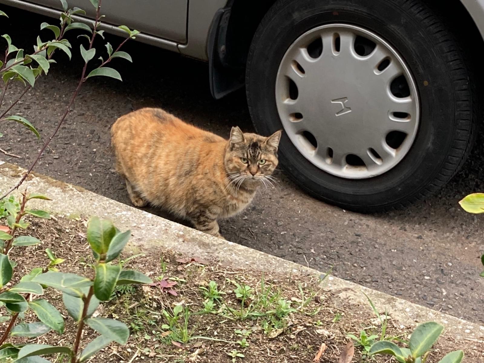 キジトラのような猫で、ピンク色のような首輪がついていました。近くに行くと逃げてしまうため、首輪の確認などはできませんでした。