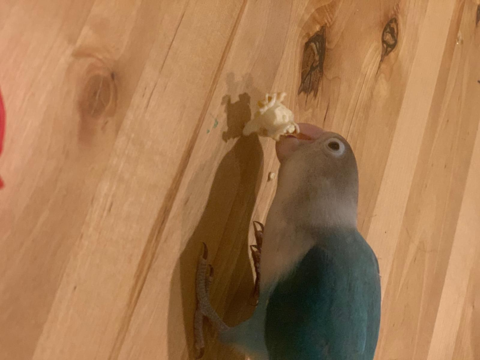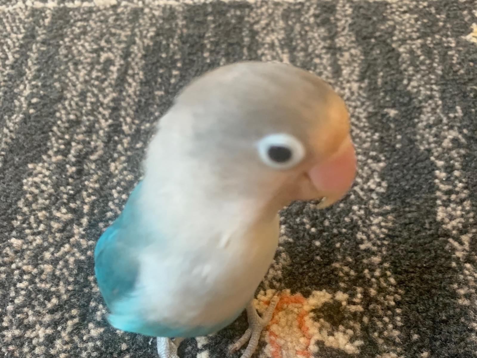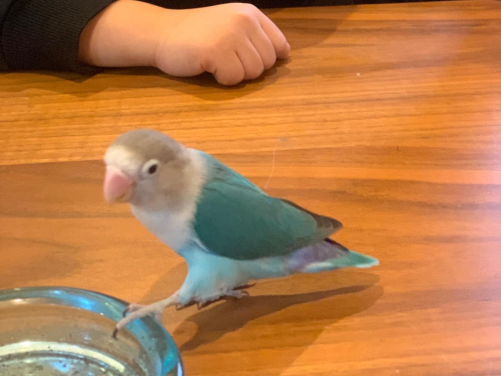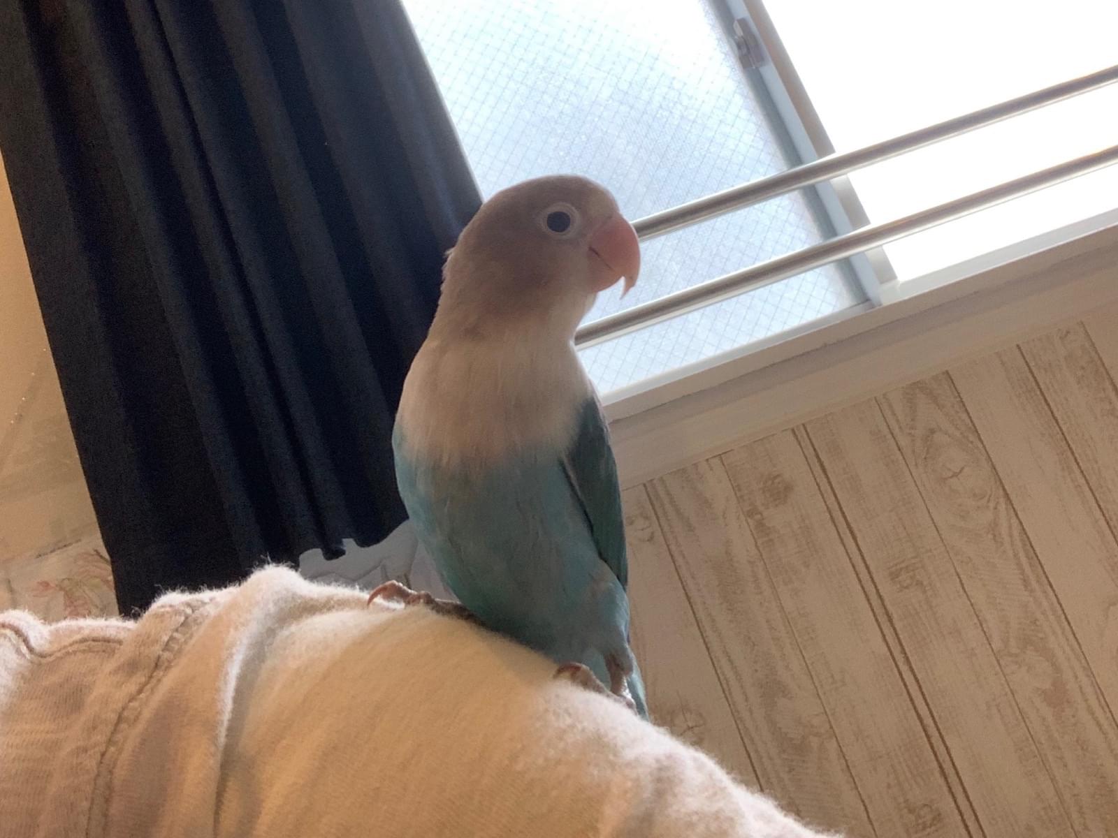人間には慣れているので、頭や肩に乗ってきます。指は噛みますが、人間が大好きなボタンインコです。