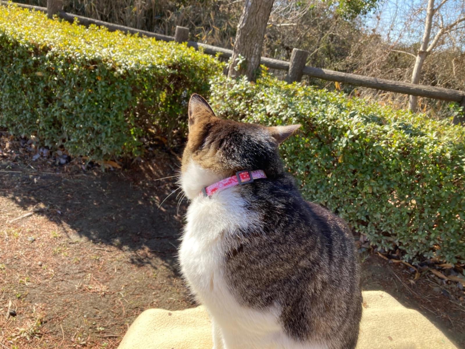 2/11の午前10時頃、ピンク色の桜模様のような首輪をしたキジシロの猫がいました。近くに行っても逃げず、落ち着いていて、人懐っこい感じの子でした。