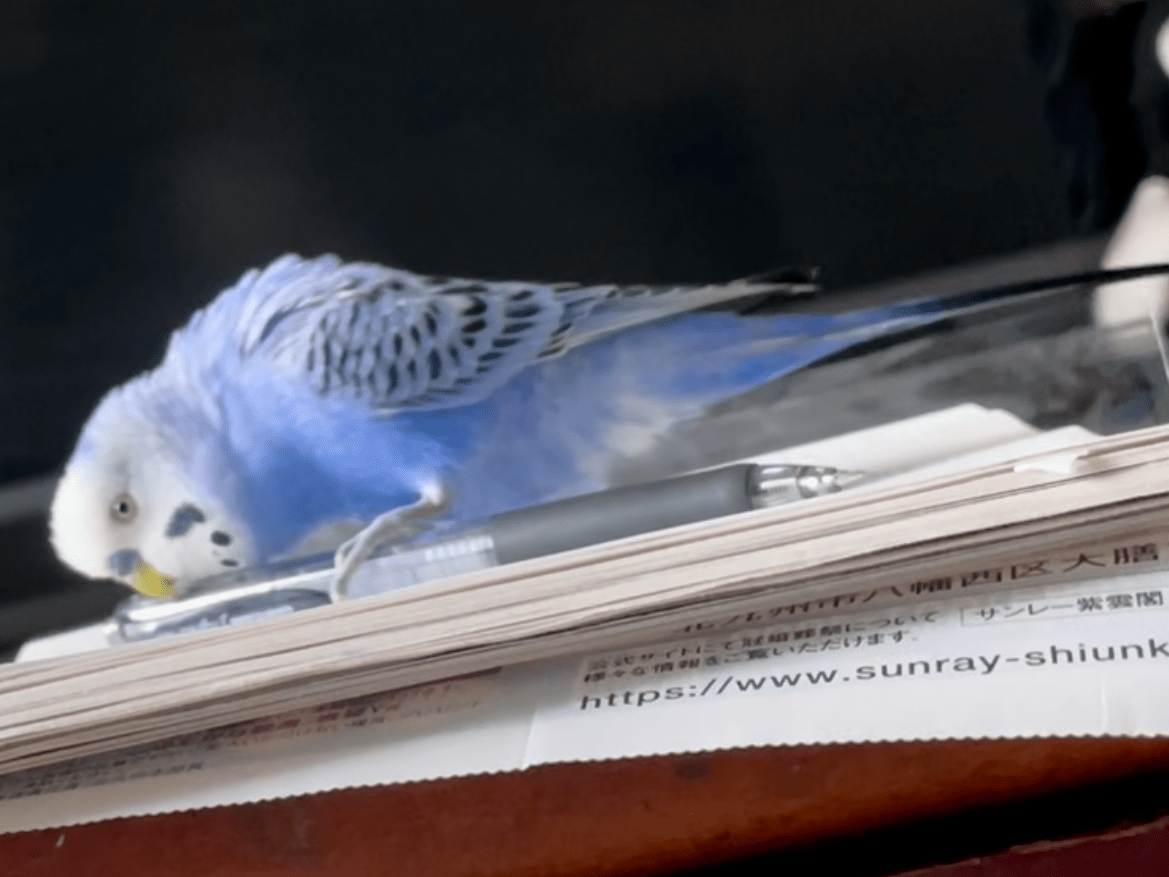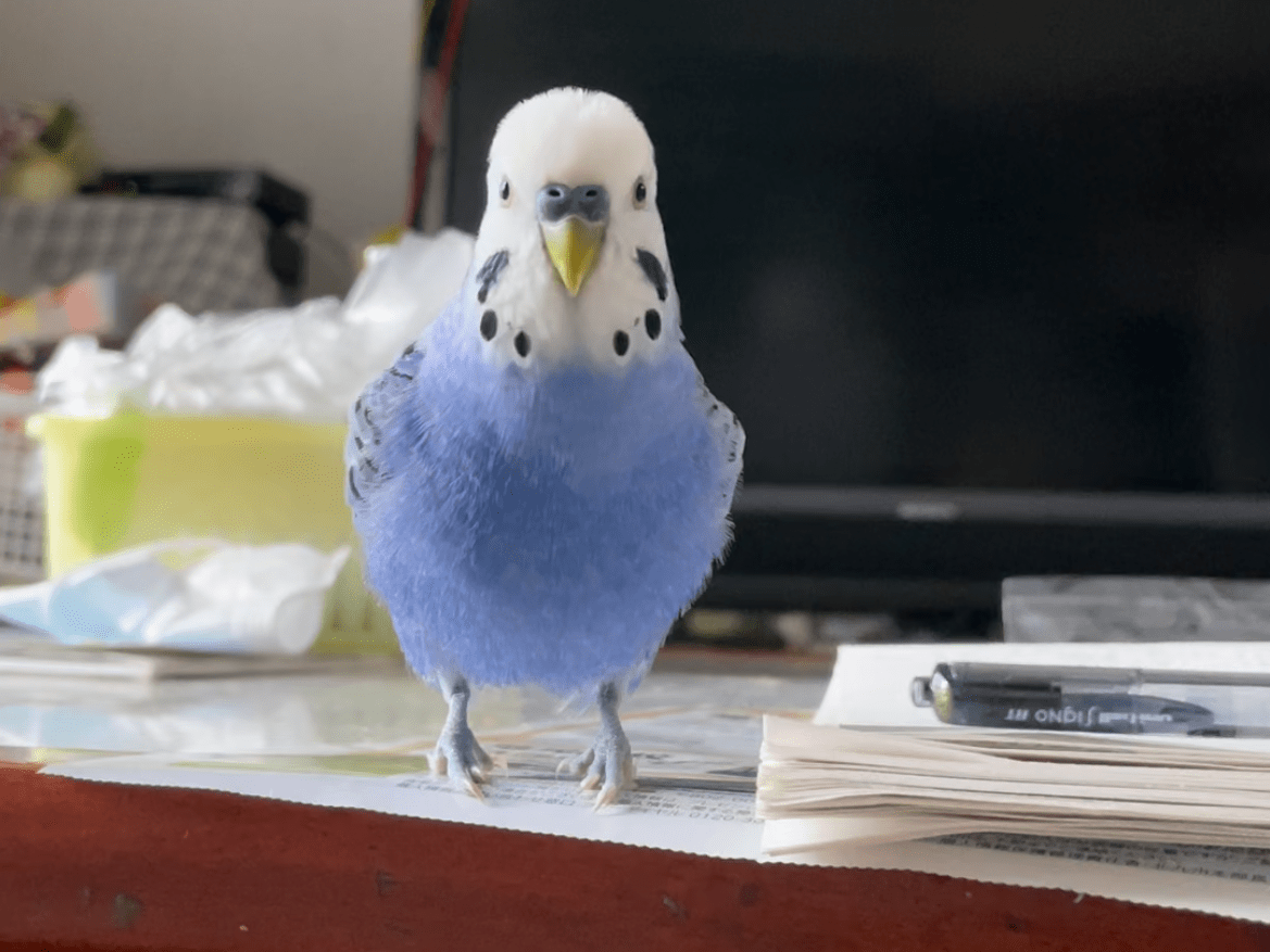 戸建ての玄関から勢いよく飛び出してしまいました。水色で顔は白色のセキセイインコです。色々な言葉を喋ります。青や茶色っぽい服に寄ってきて、よく肩に乗ります。黄色い縫いぐるみや鏡なども好きです。