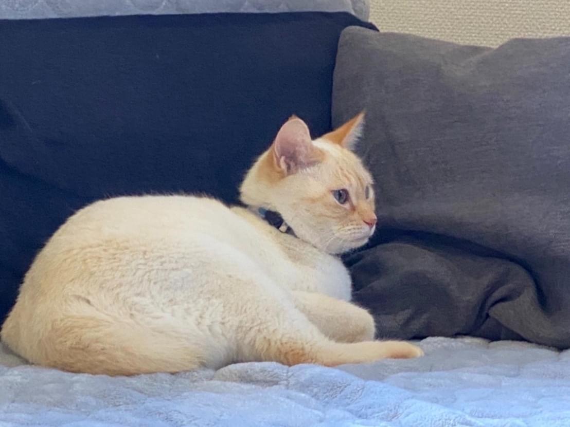 クリームっぽい白い体に茶色の耳、青色の目とピンクの鼻です。