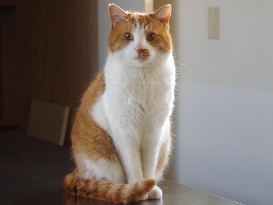 明るい茶色で薄くシマシマがあります。ハチワレから身体の前から肩まわり、お腹まわりは白く、頭の上から背中、長いしっぽにかけて明るい茶色のシマシマです。