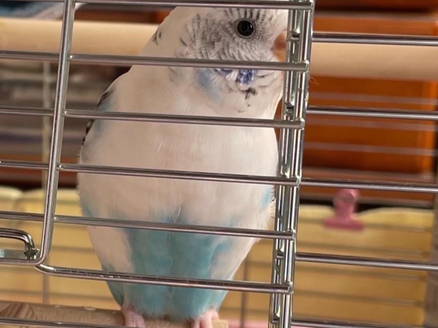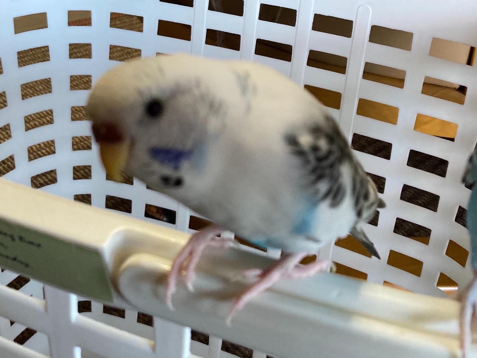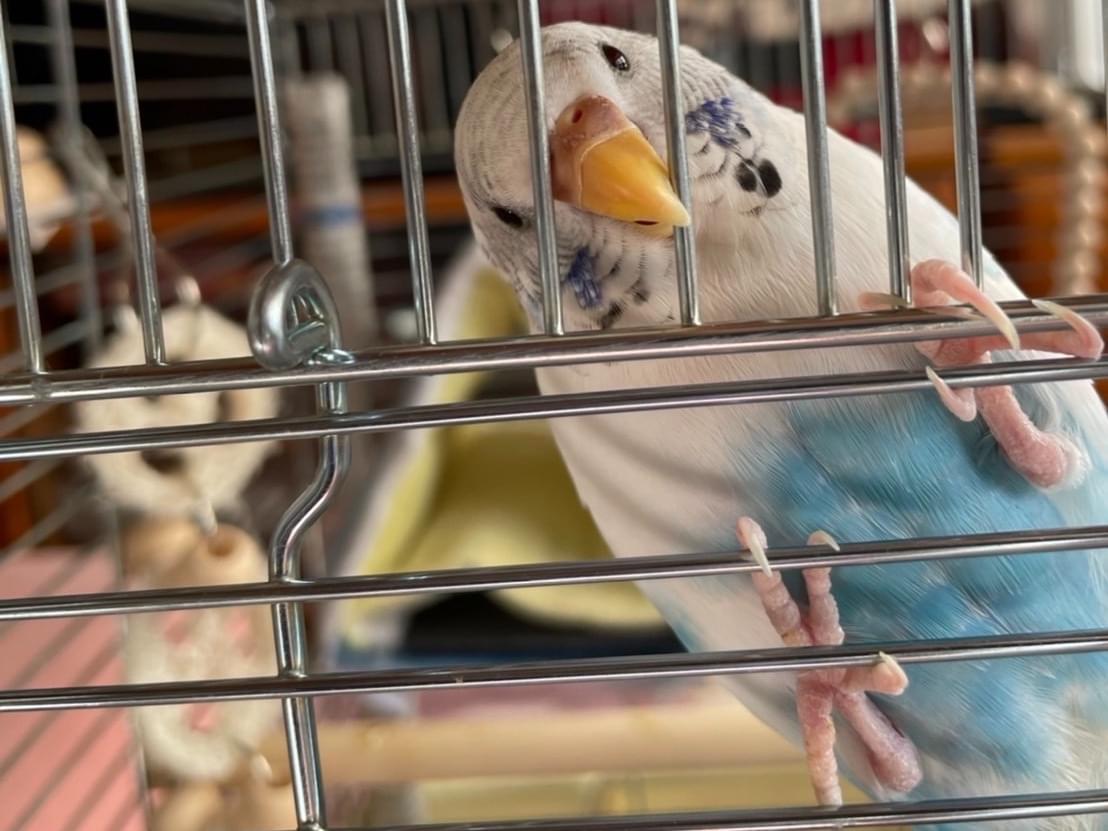 特徴ですがベースは白く羽と頭は黒い模様。胸から足まではブルーです。鼻はアーモンド色で最近乾燥気味。